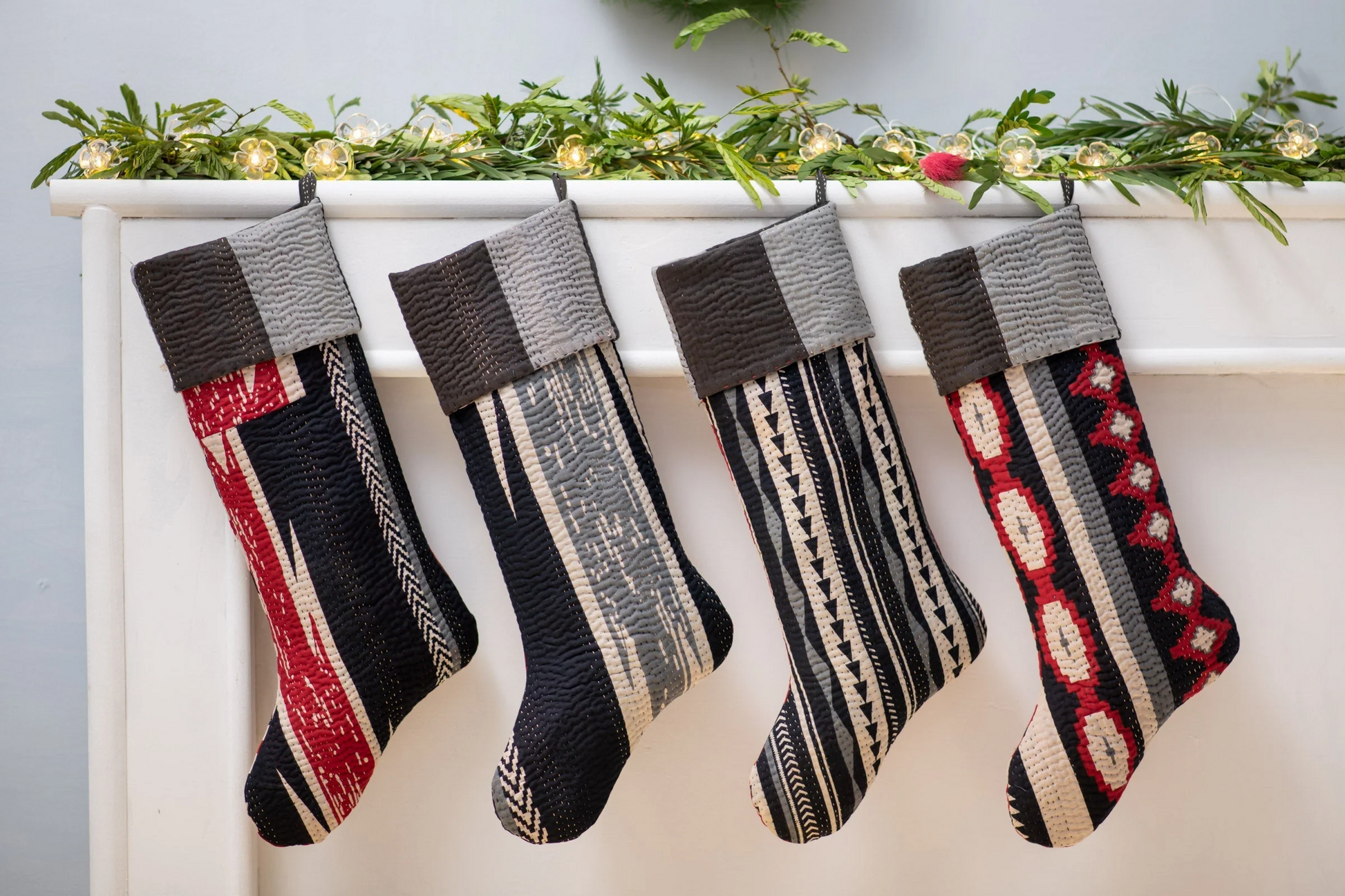 Monotone Ikat Handmade Vintage Kantha Holiday Stocking -Monotone Black-