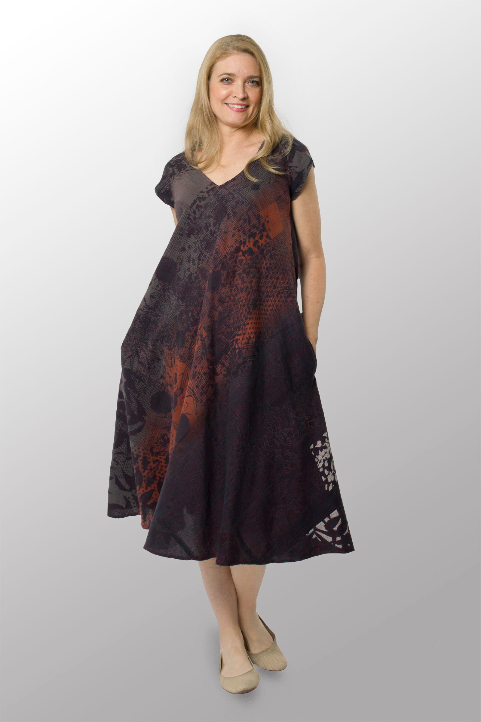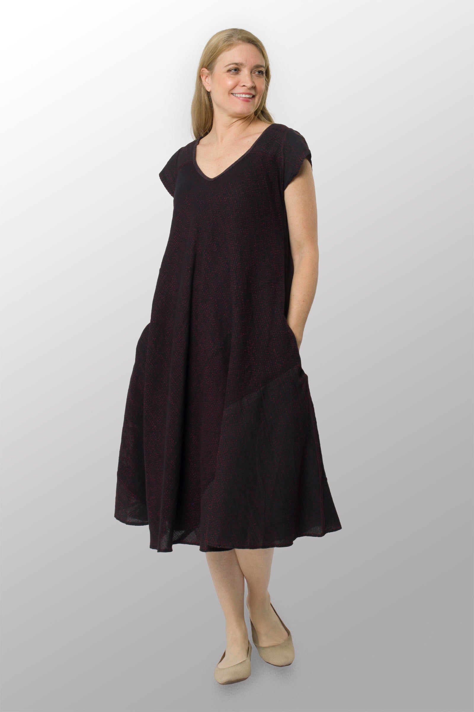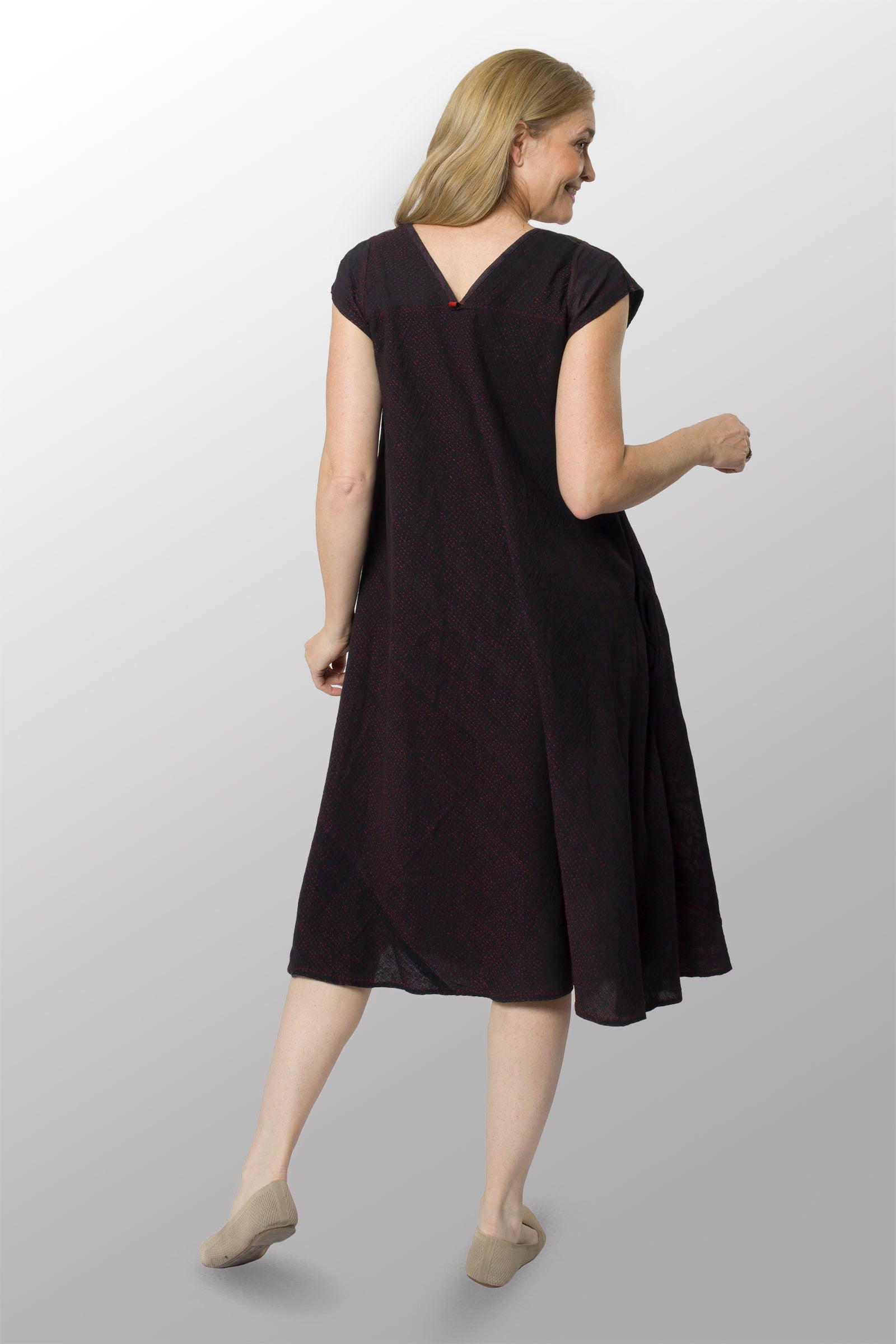 MONOTONE TWILIGHT PRINT KANTHA CAP SLV. FLARE DRESS - tp2425-red -