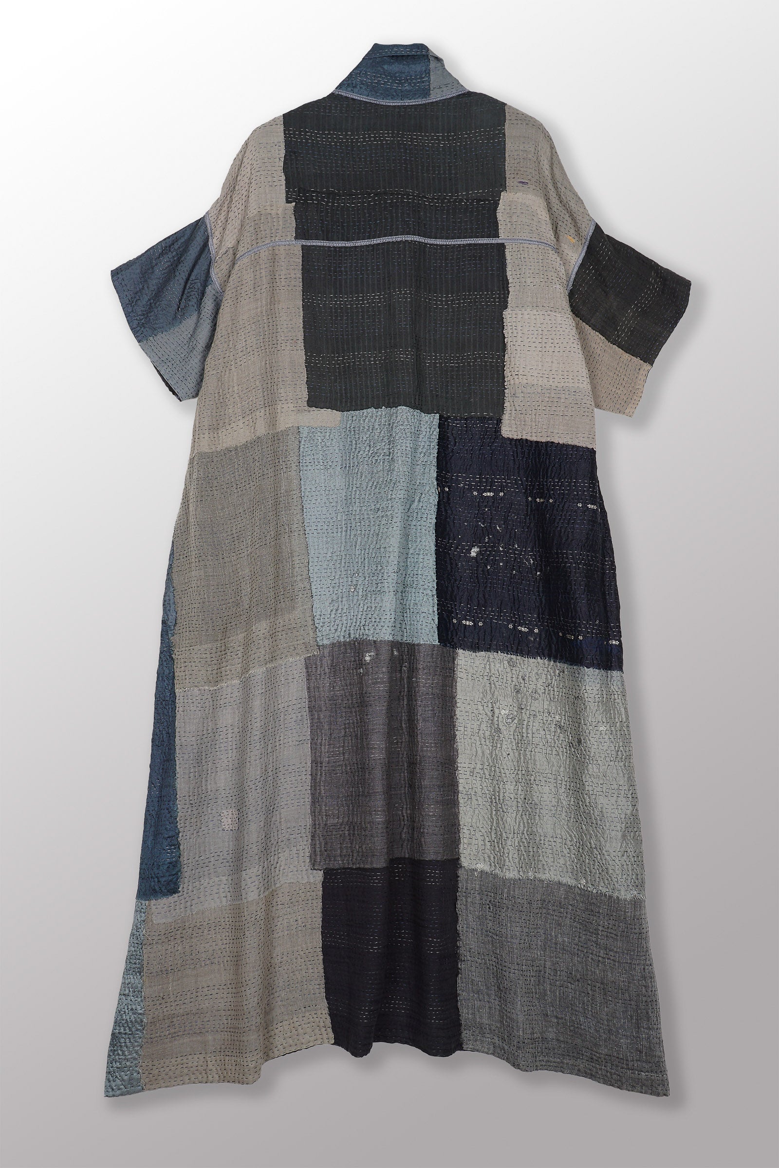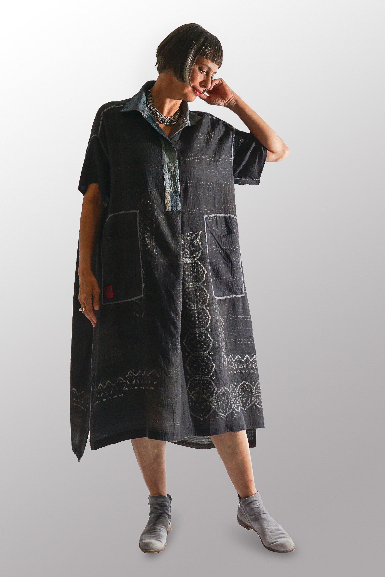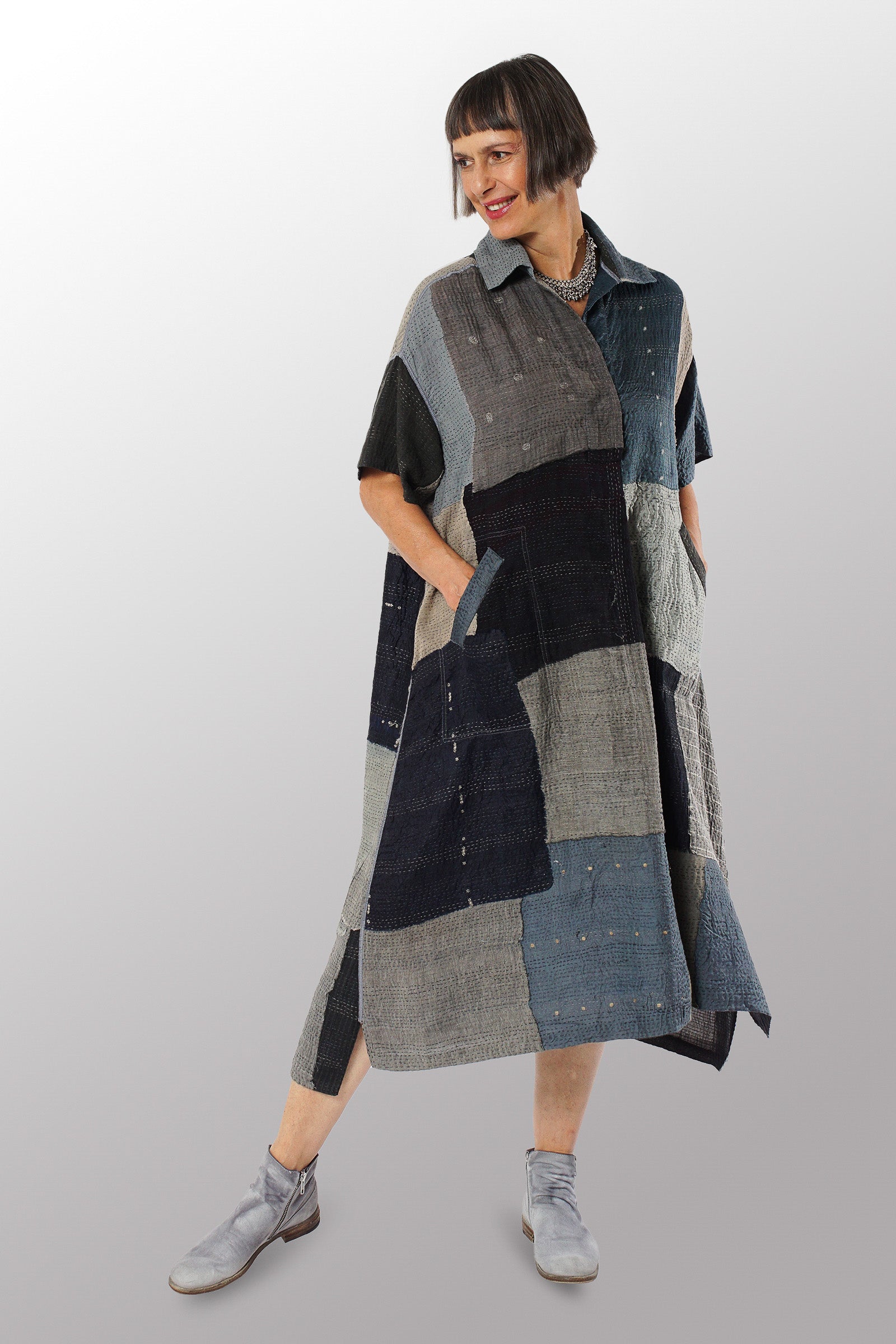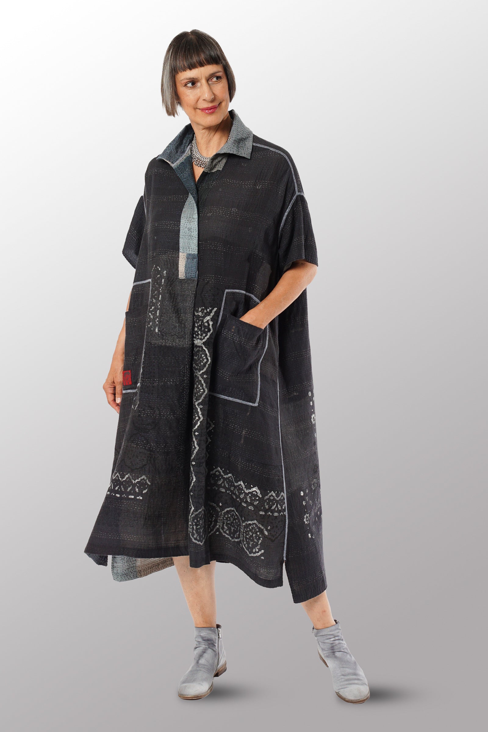 MOSAIC FRAY PATCH KANTHA WING COLLAR DRESS - zb2454-gry -