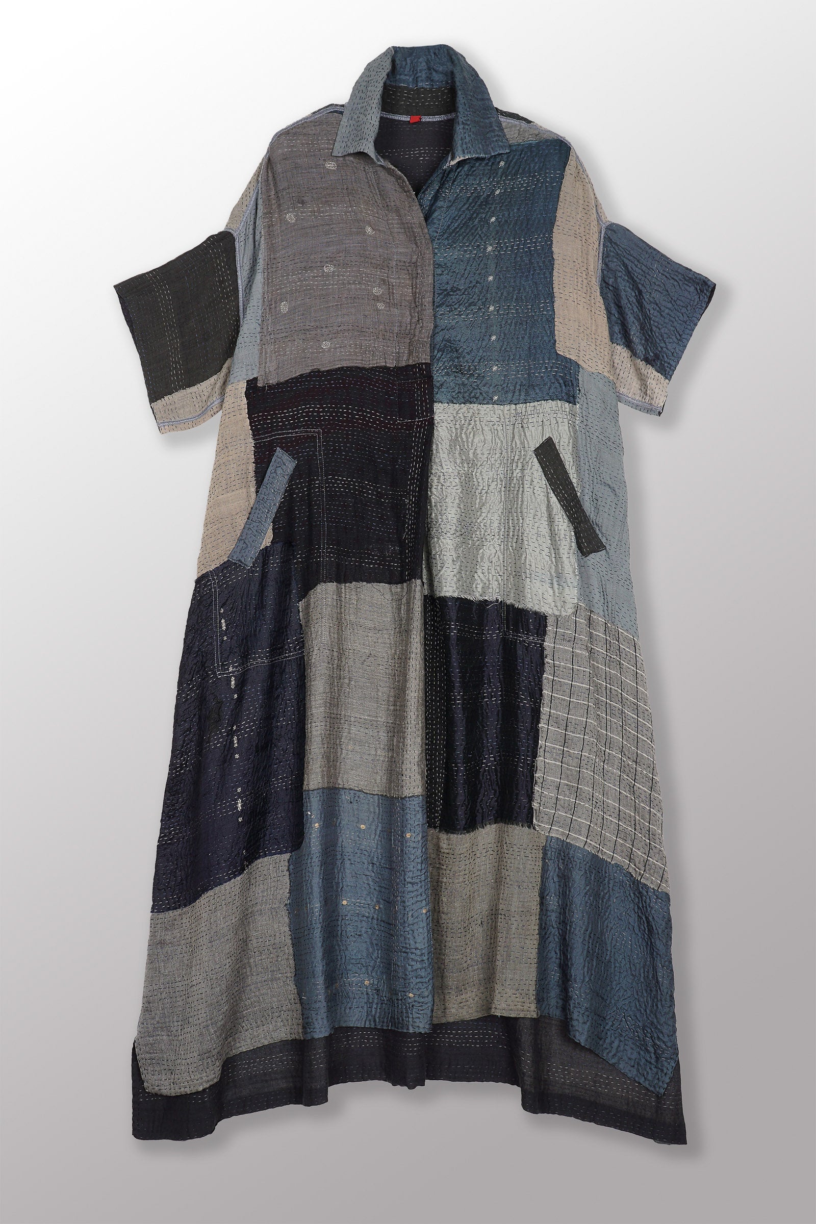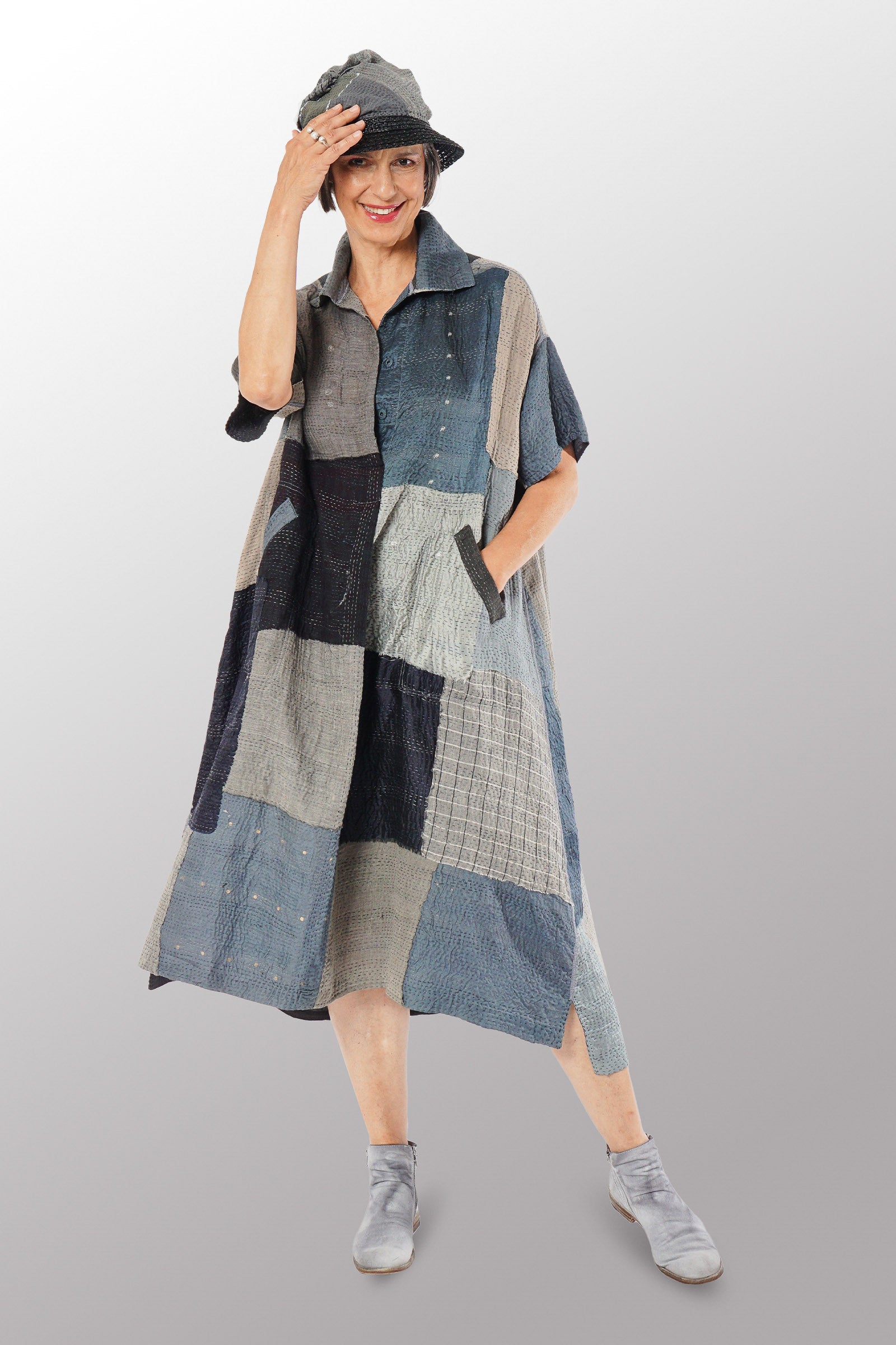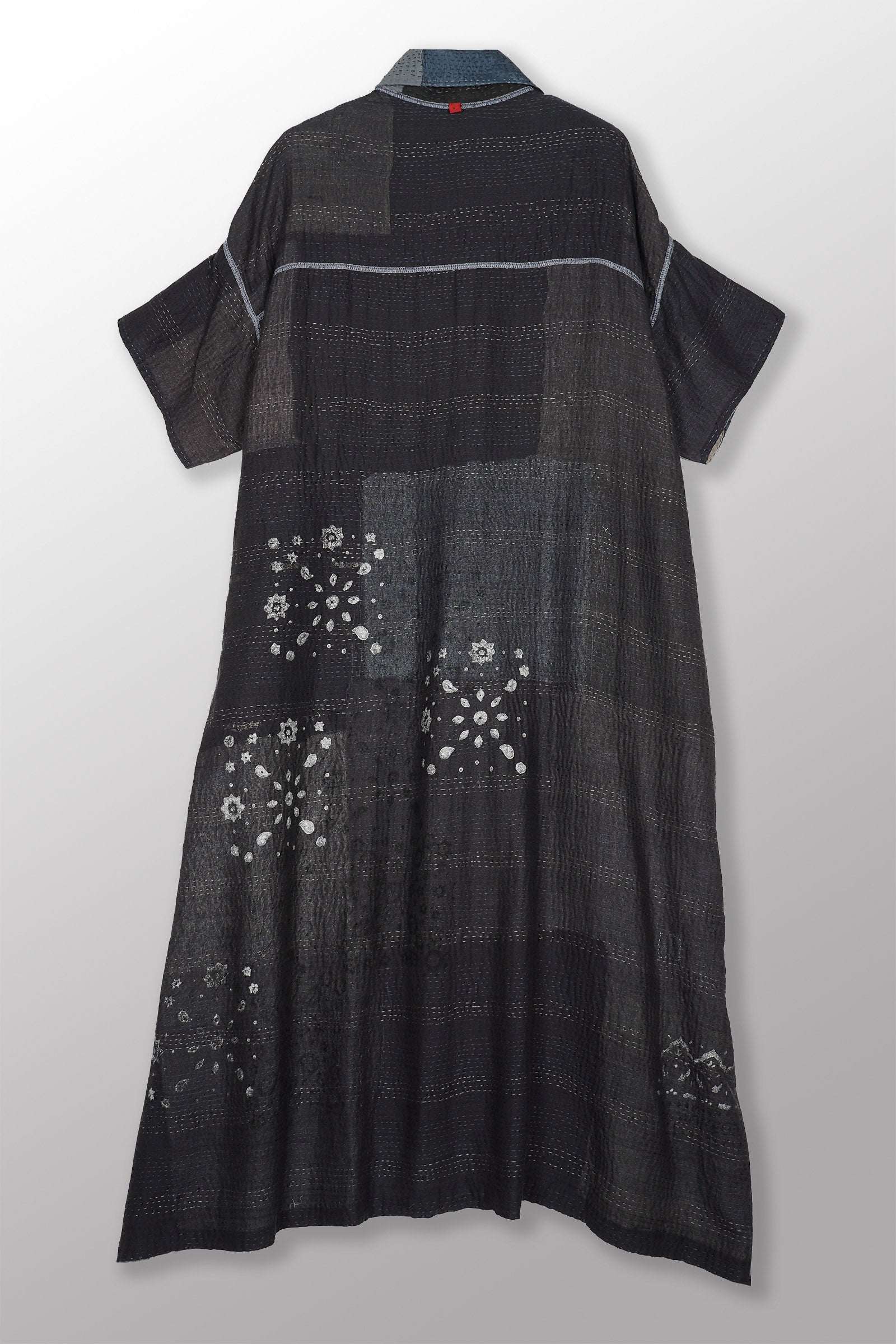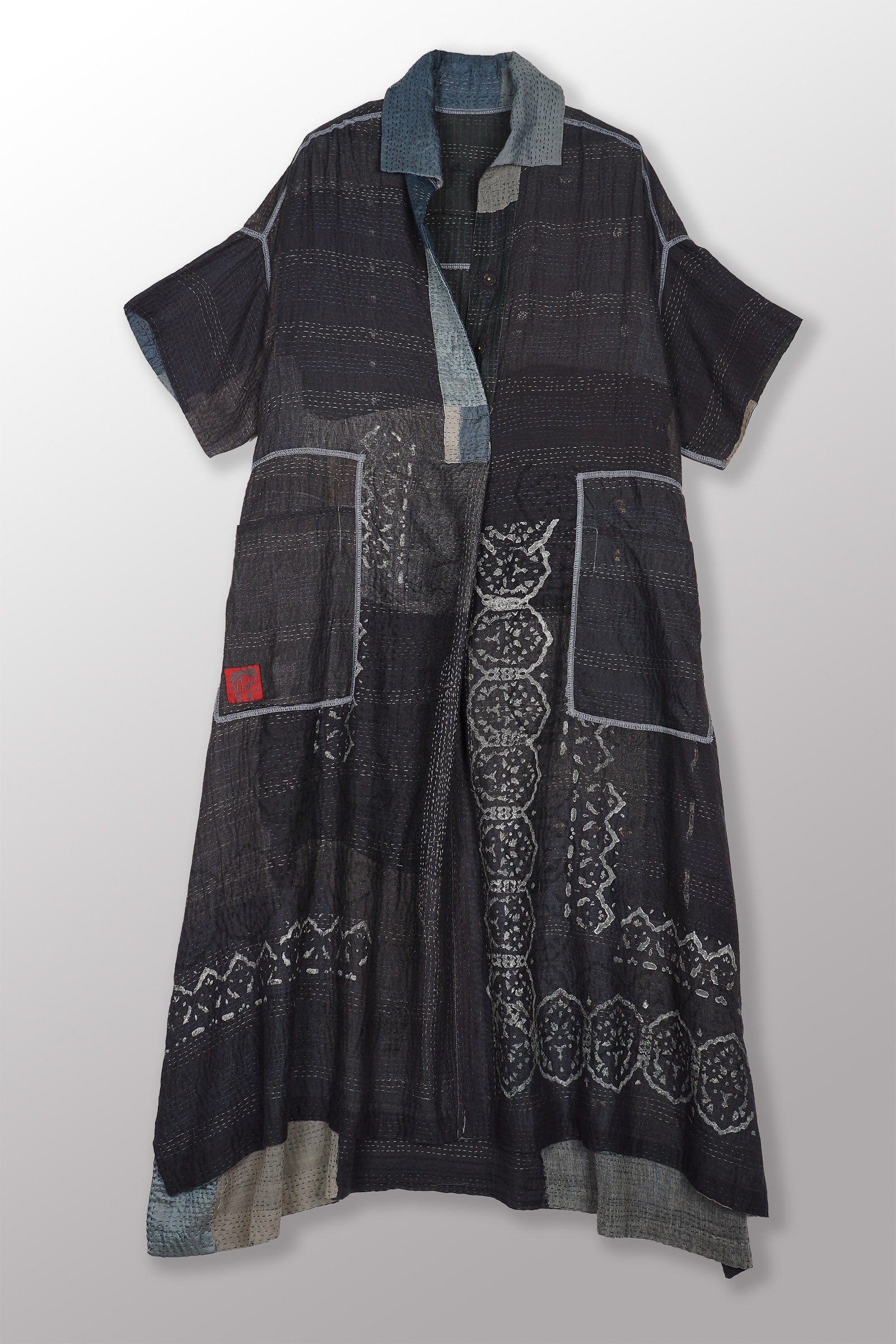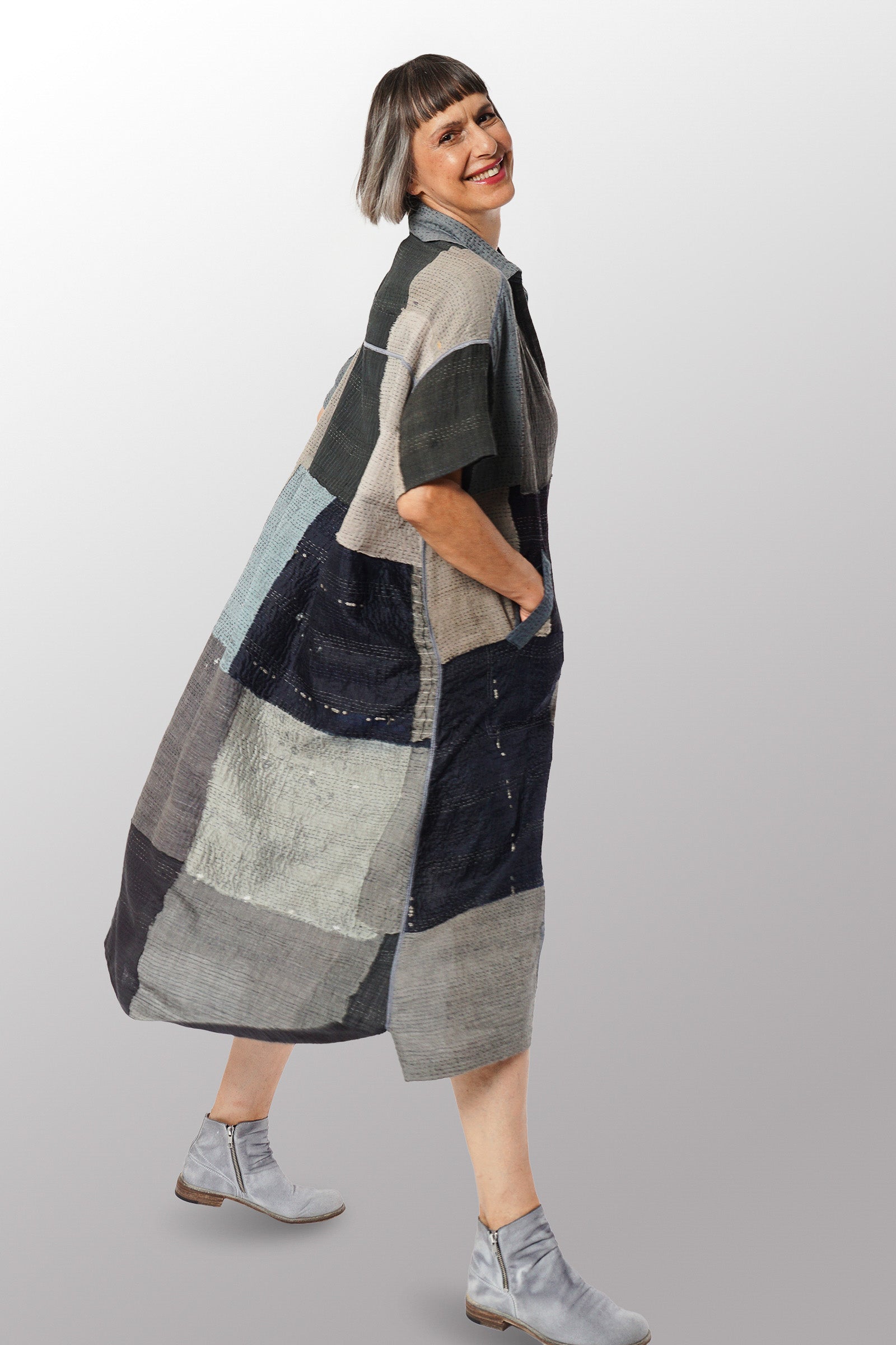 MOSAIC FRAY PATCH KANTHA WING COLLAR DRESS - zb2454-gry -