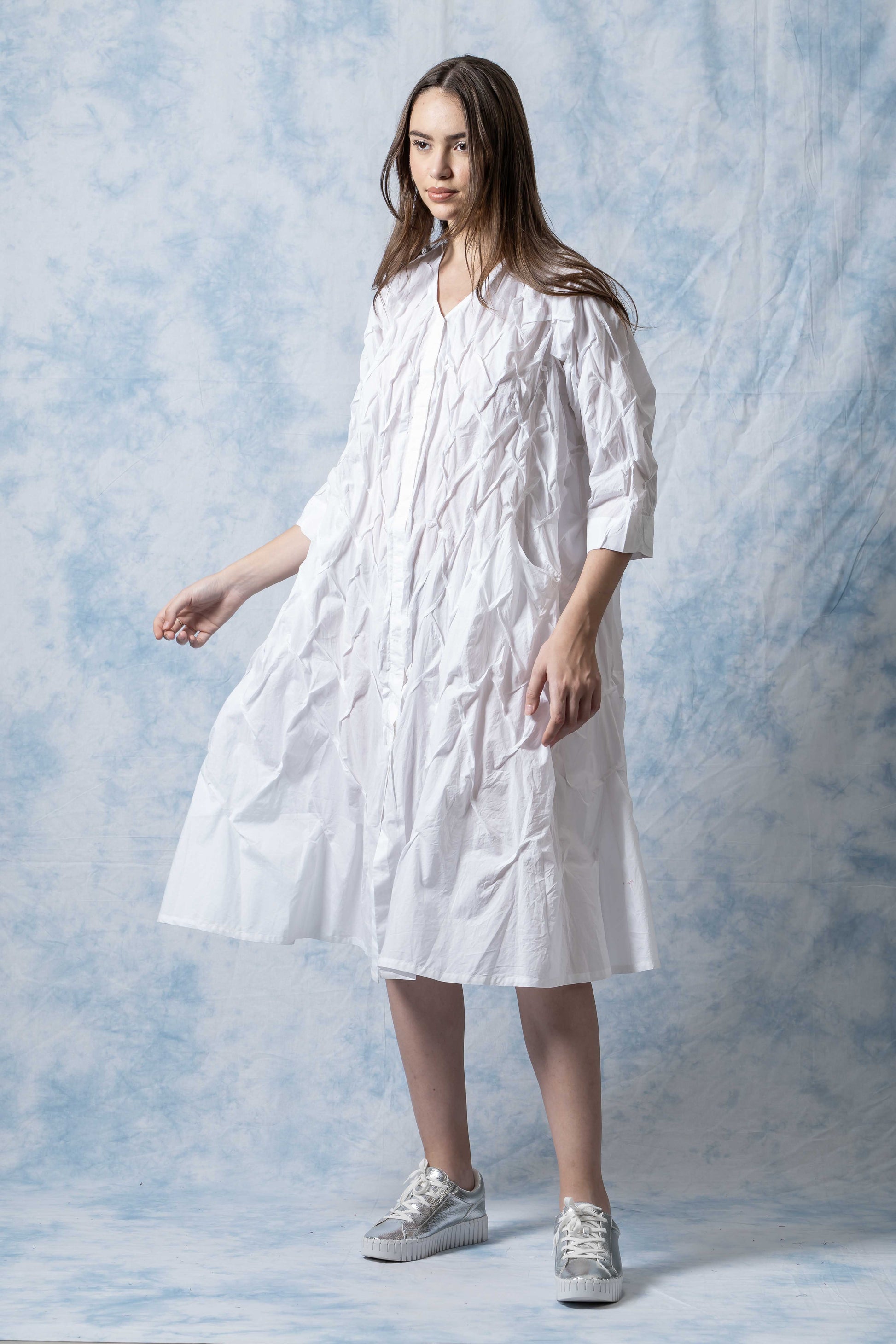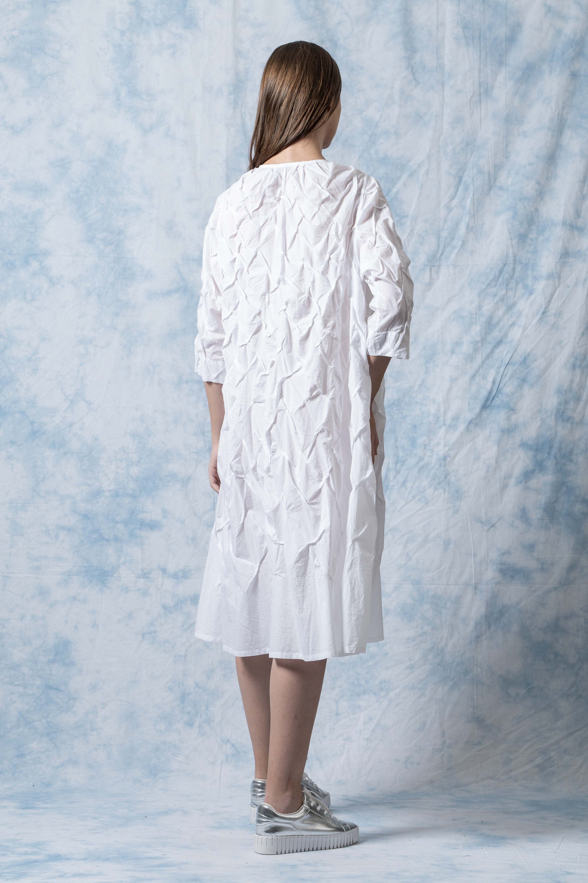 POLISHED COTTON WAVY TUCK A-LINE DRESS - bl-wl1453-ivy -
