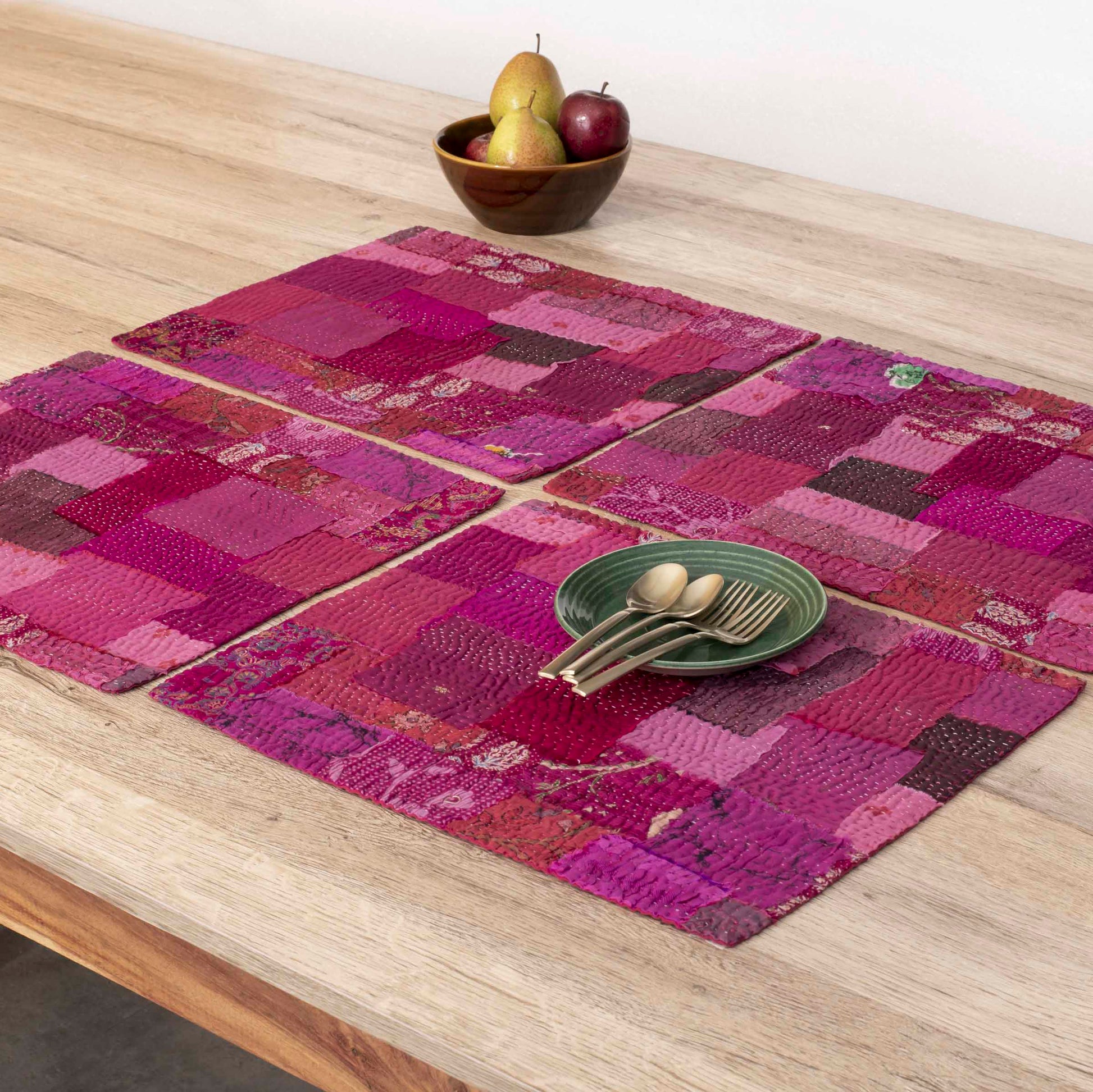 Printed Fray Vintage Cotton Kantha Placemat -Pink (SET OF 2)