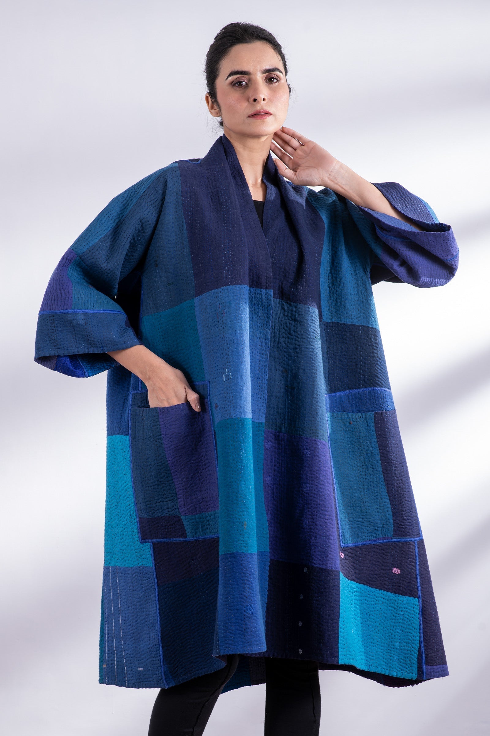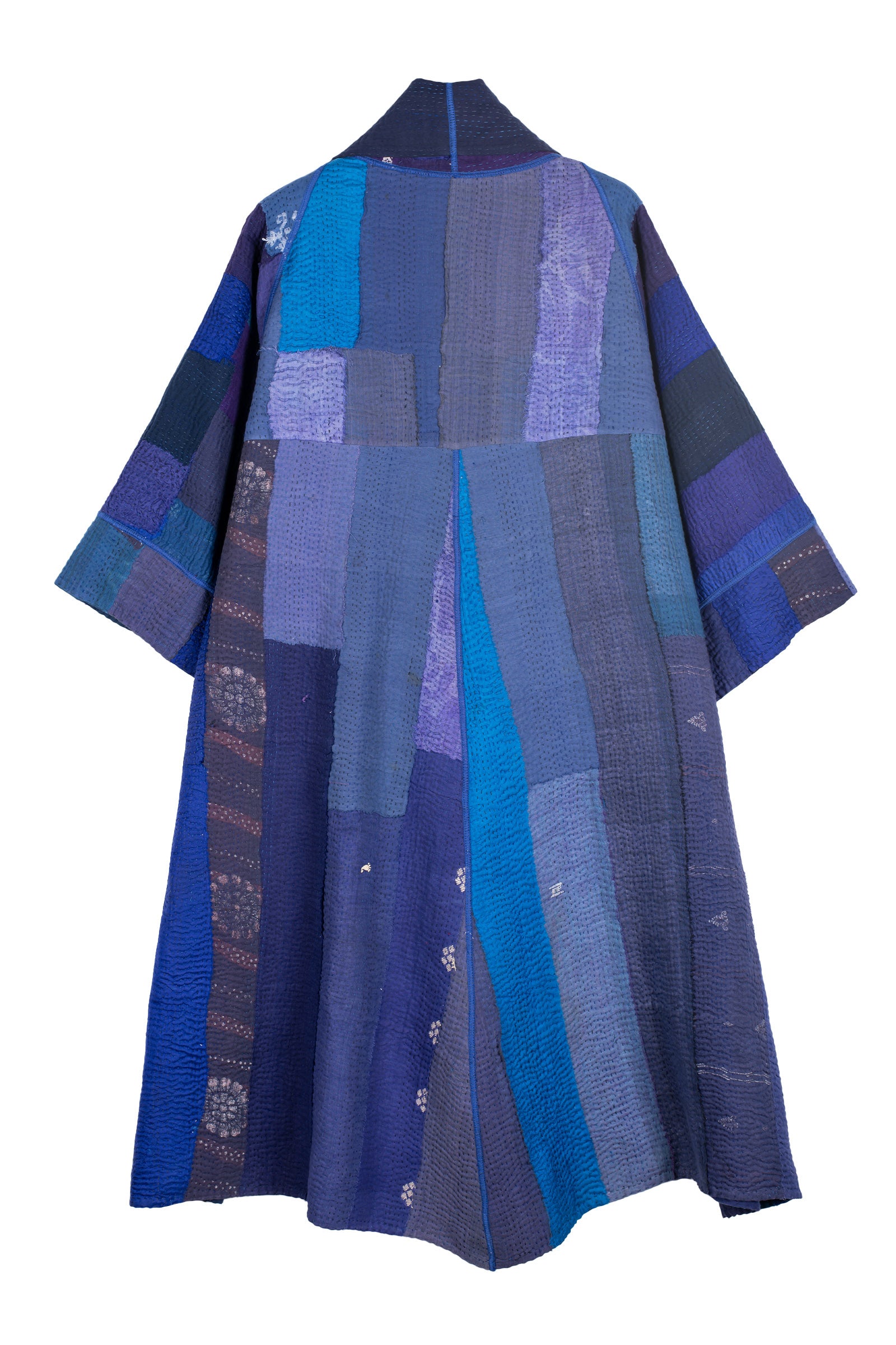STRIPE AND CHECK COTTON SILK PATCH KANTHA 3/4 SLV. A-LINE DUSTER - ss4324-blu -