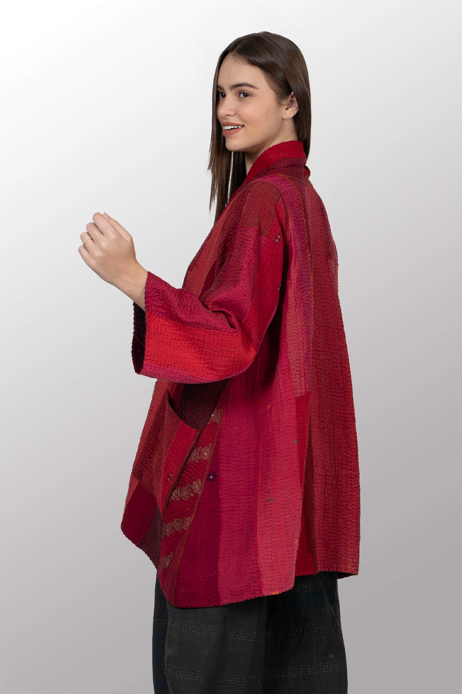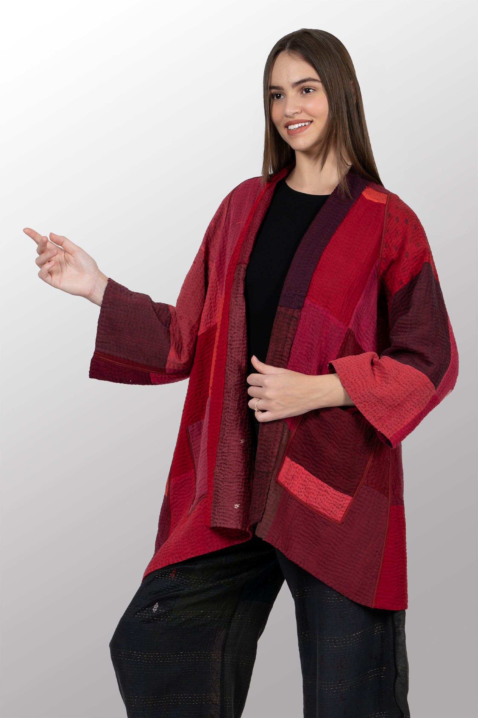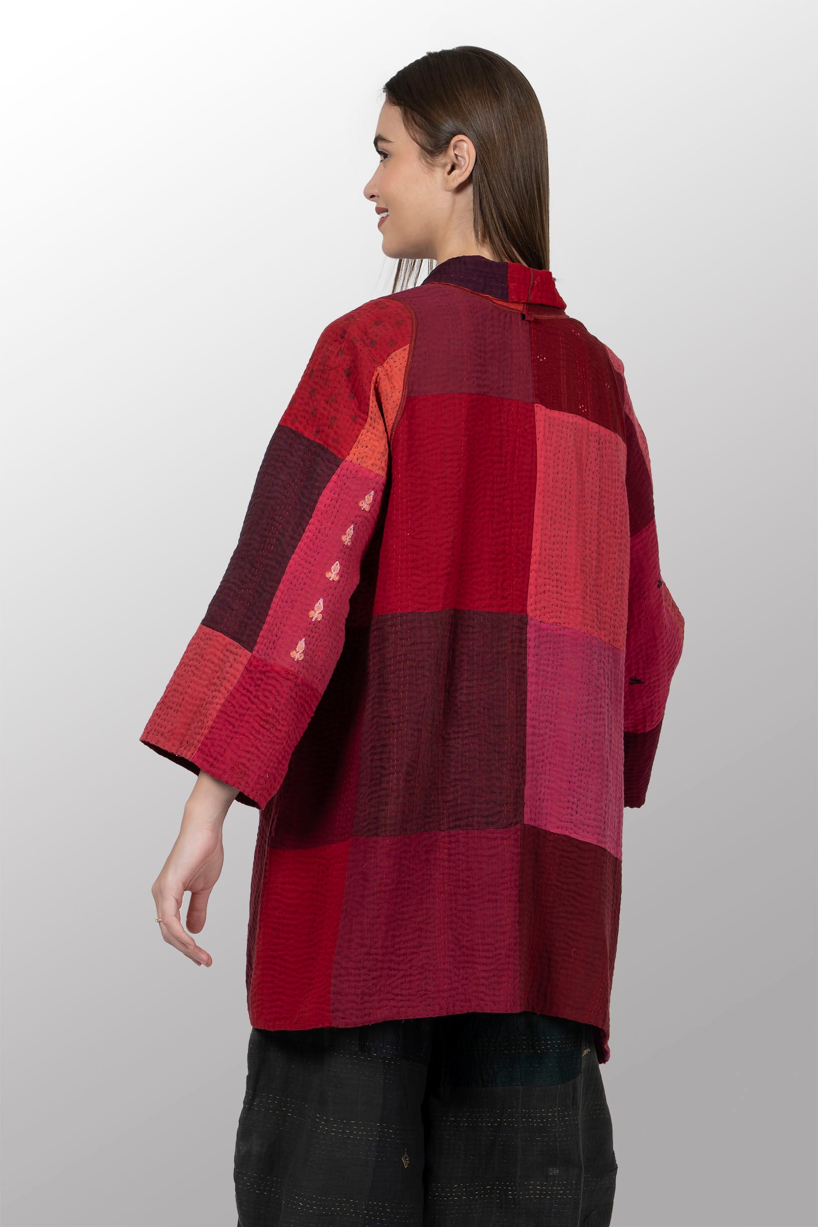 STRIPE AND CHECK COTTON SILK PATCH KANTHA A-LINE JACKET - ss4003-red -