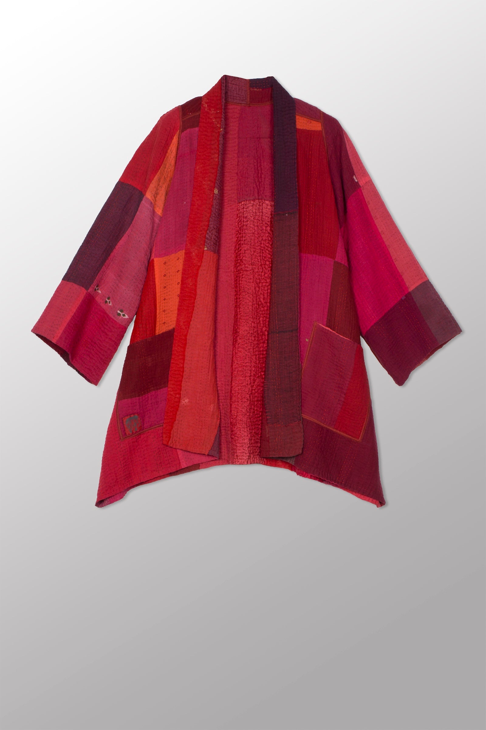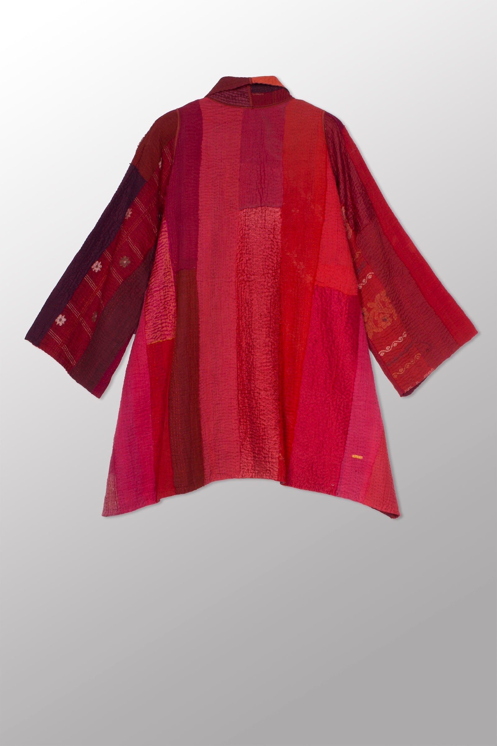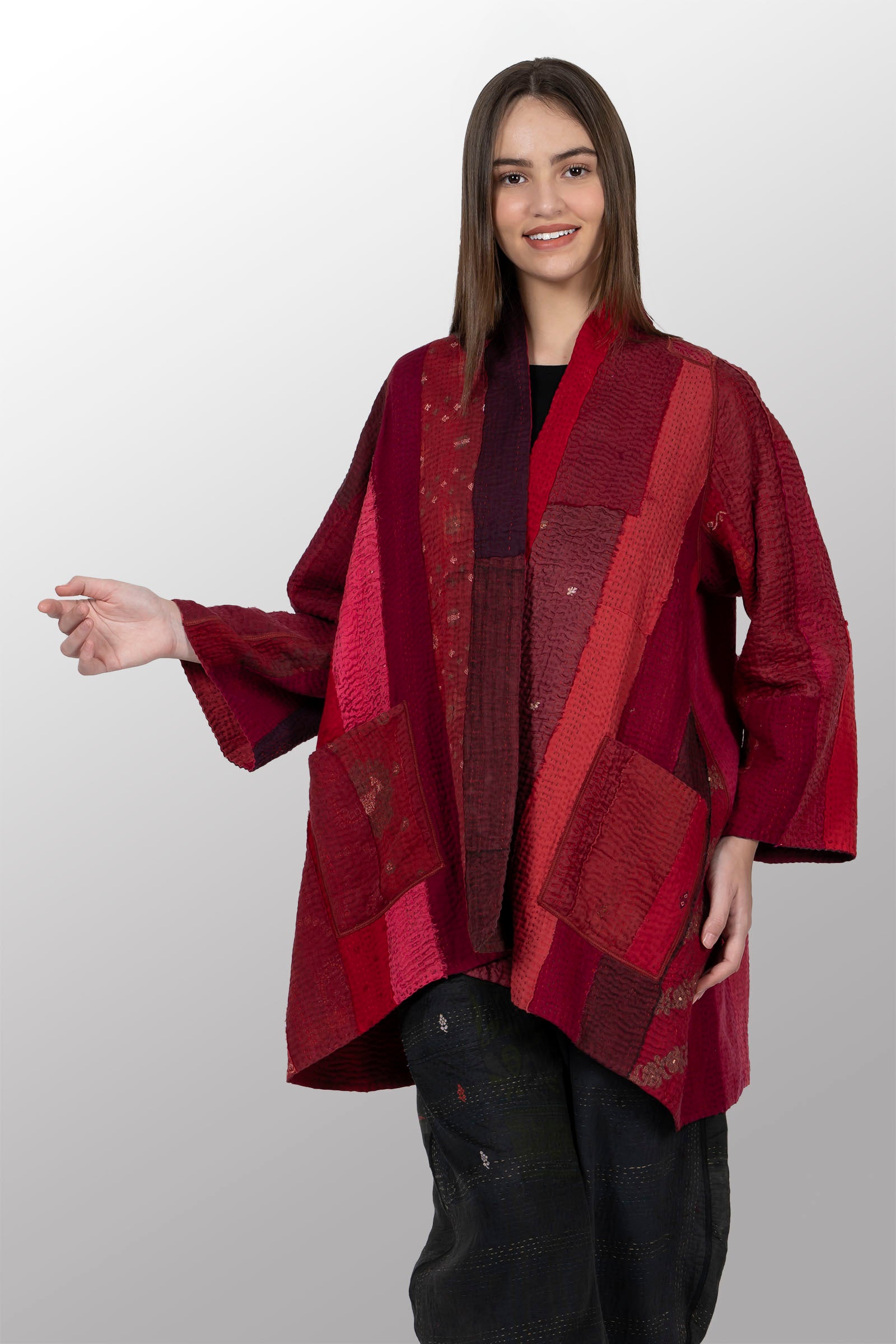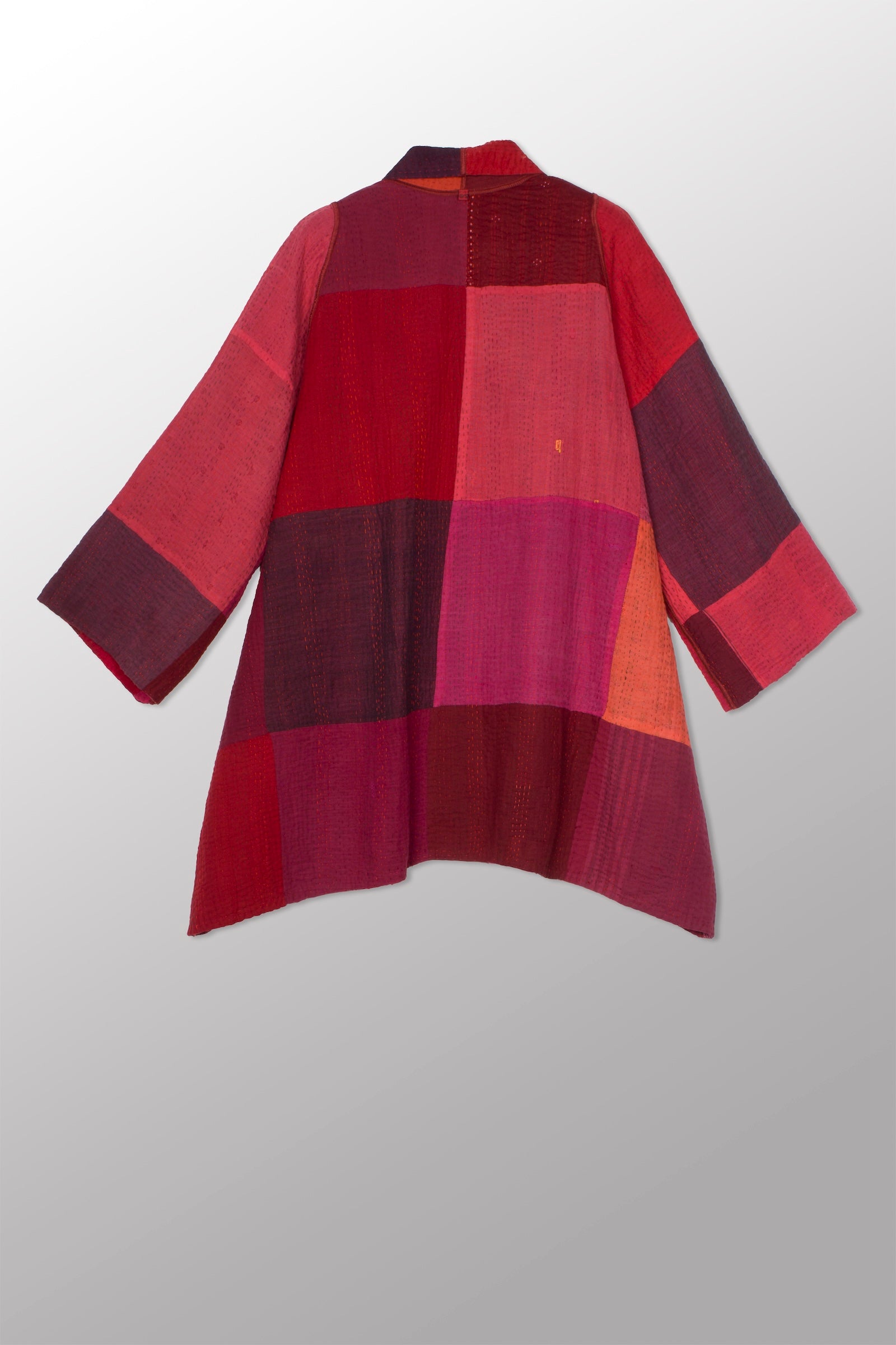 STRIPE AND CHECK COTTON SILK PATCH KANTHA A-LINE JACKET - ss4003-red -