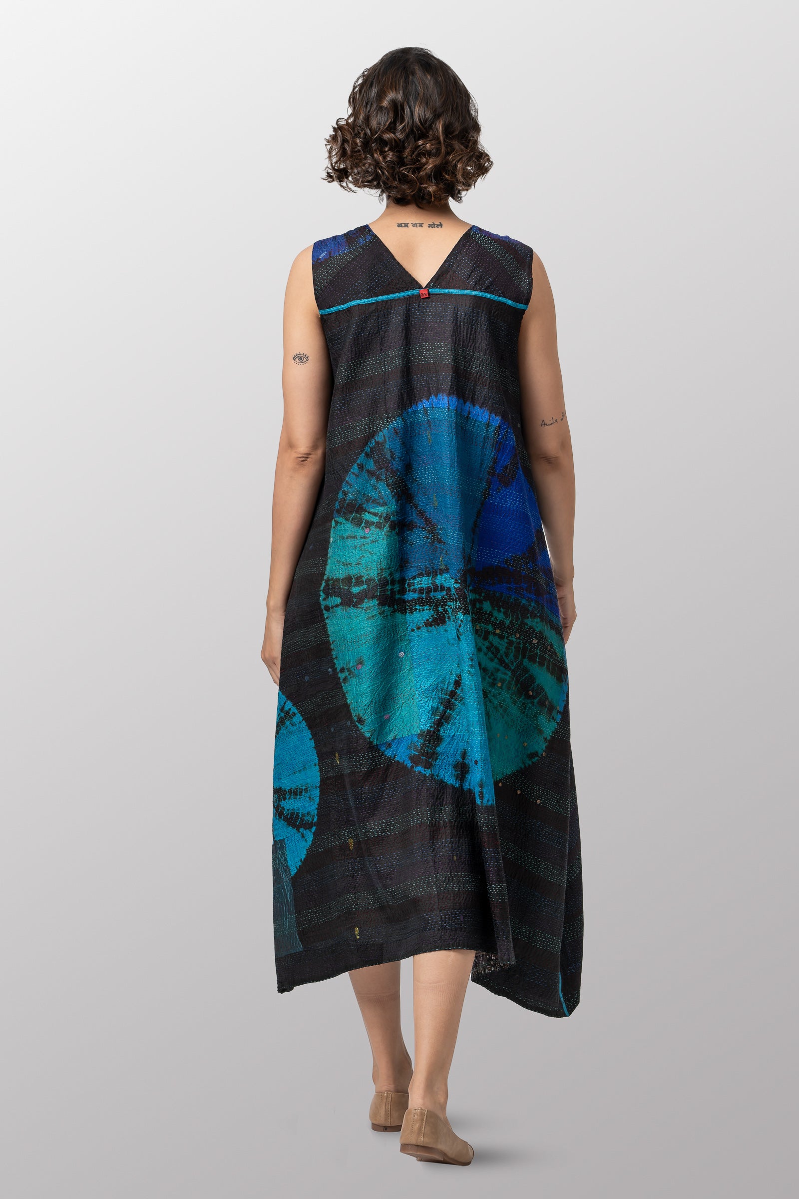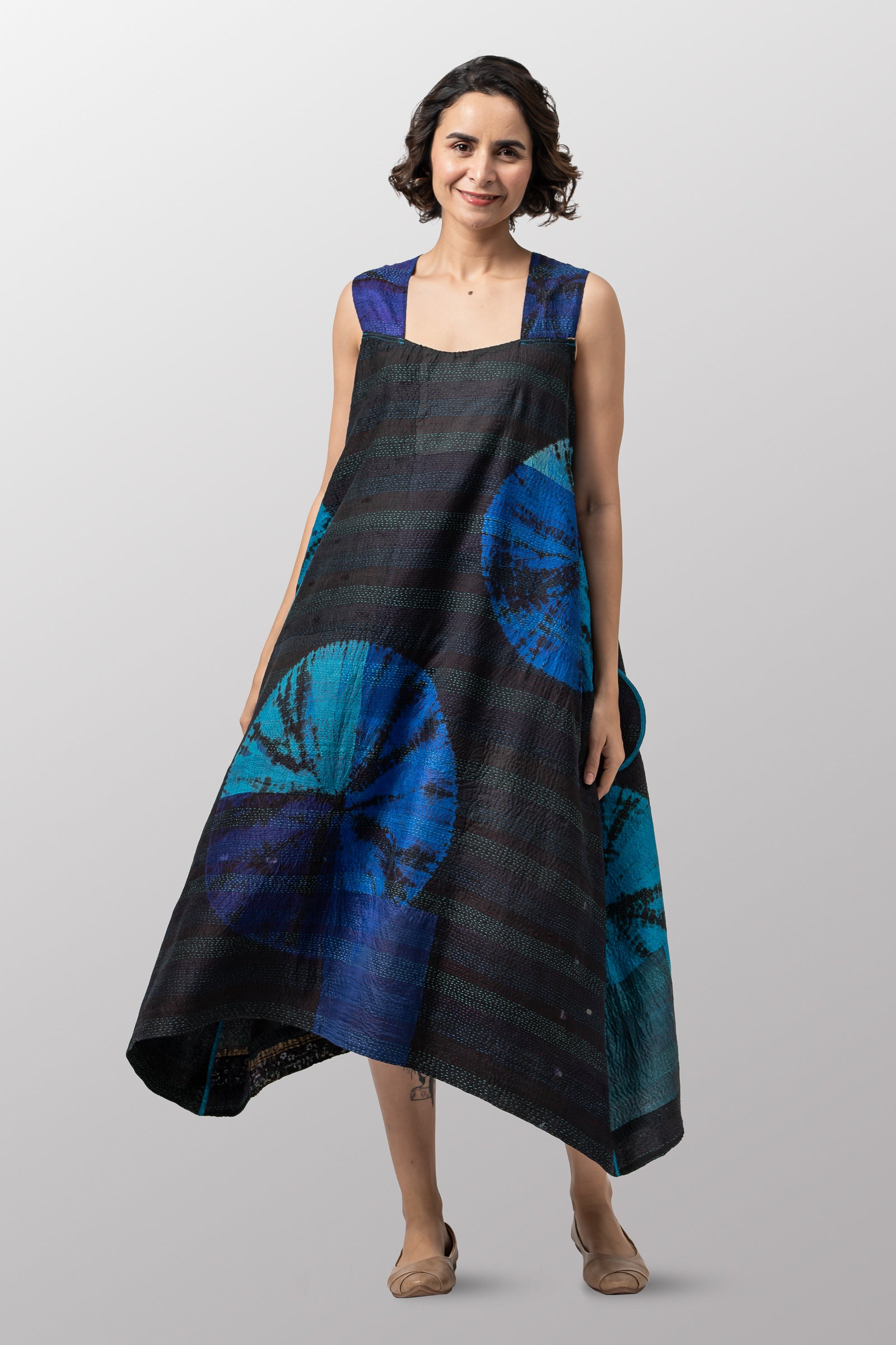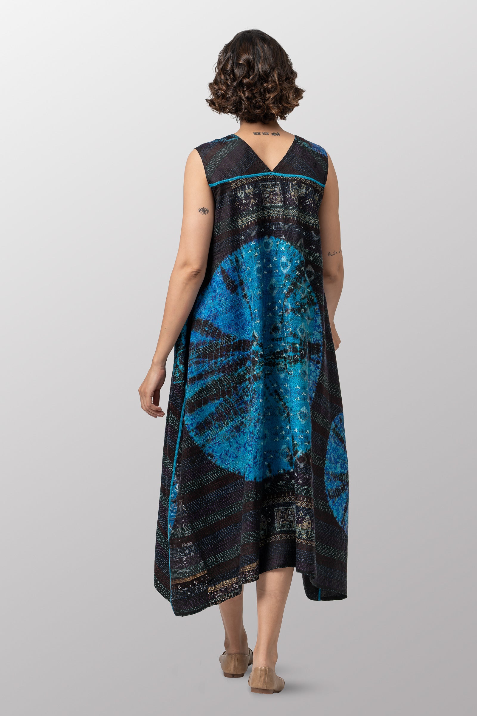 TIE DYE CIRCLE SHIBORI KANTHA TENT DRESS - td2413-blu -