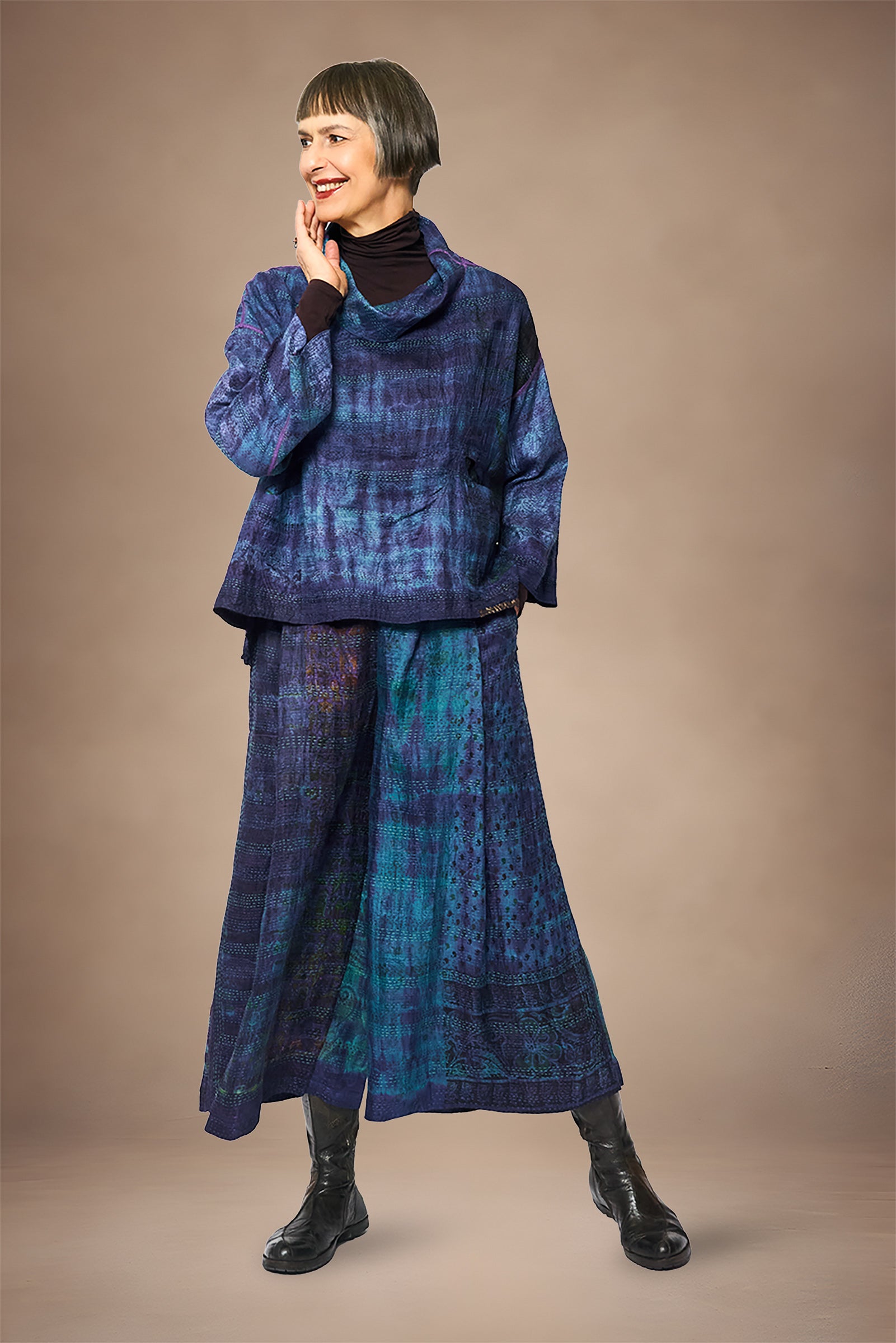 TIE DYE VINTAGE SILK KANTHA COWL PULLOVER - st-sv2547-nvy -