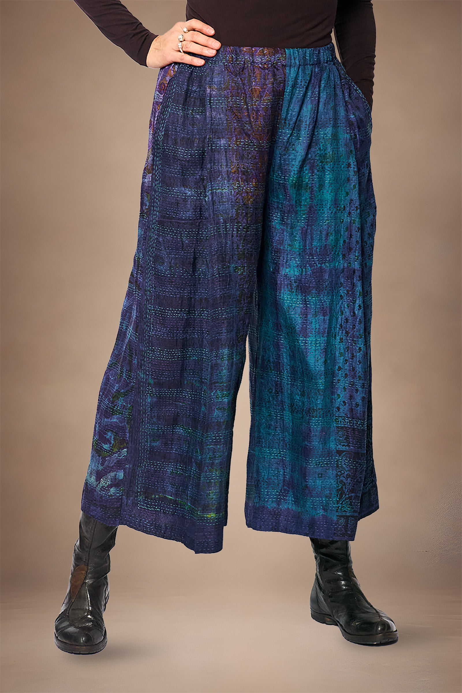 TIE DYE VINTAGE SILK KANTHA WIDE LEG LANTERN PANTS - st-sv2646-nvy -