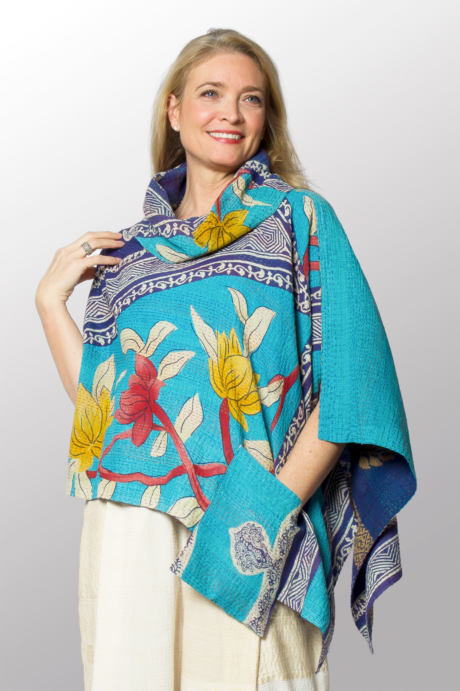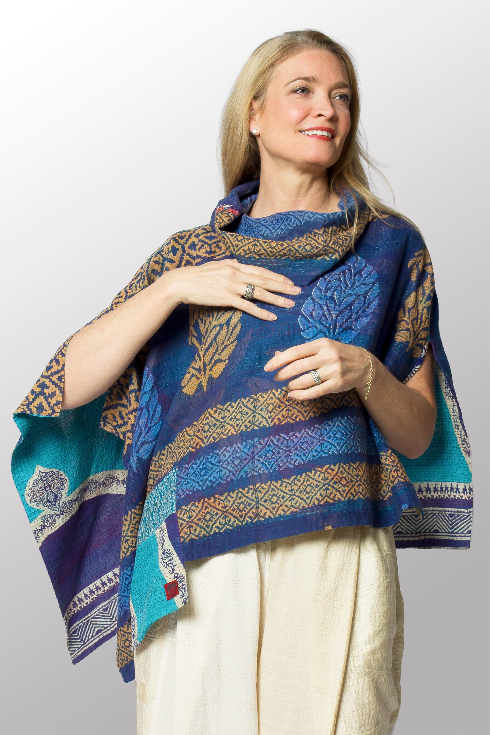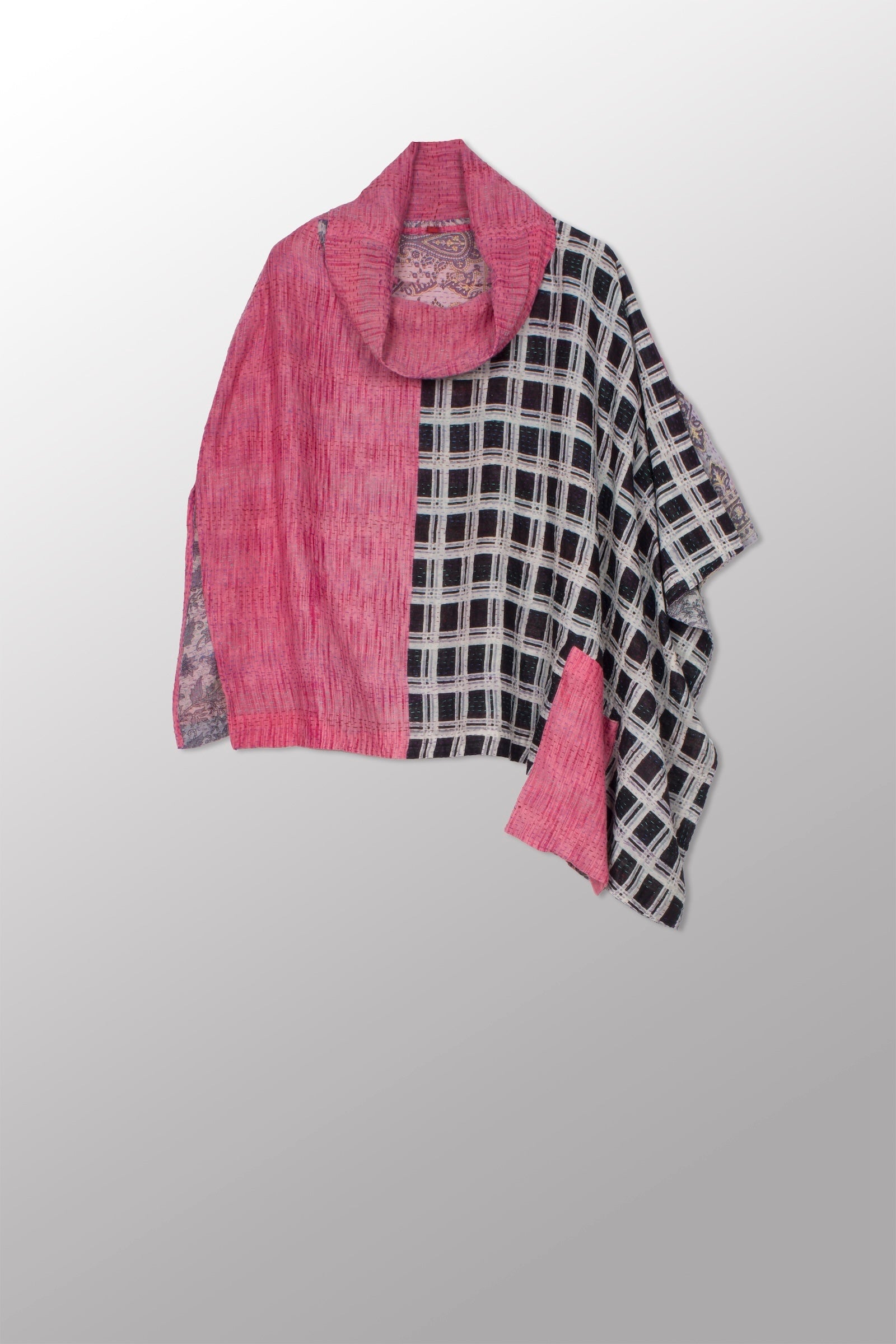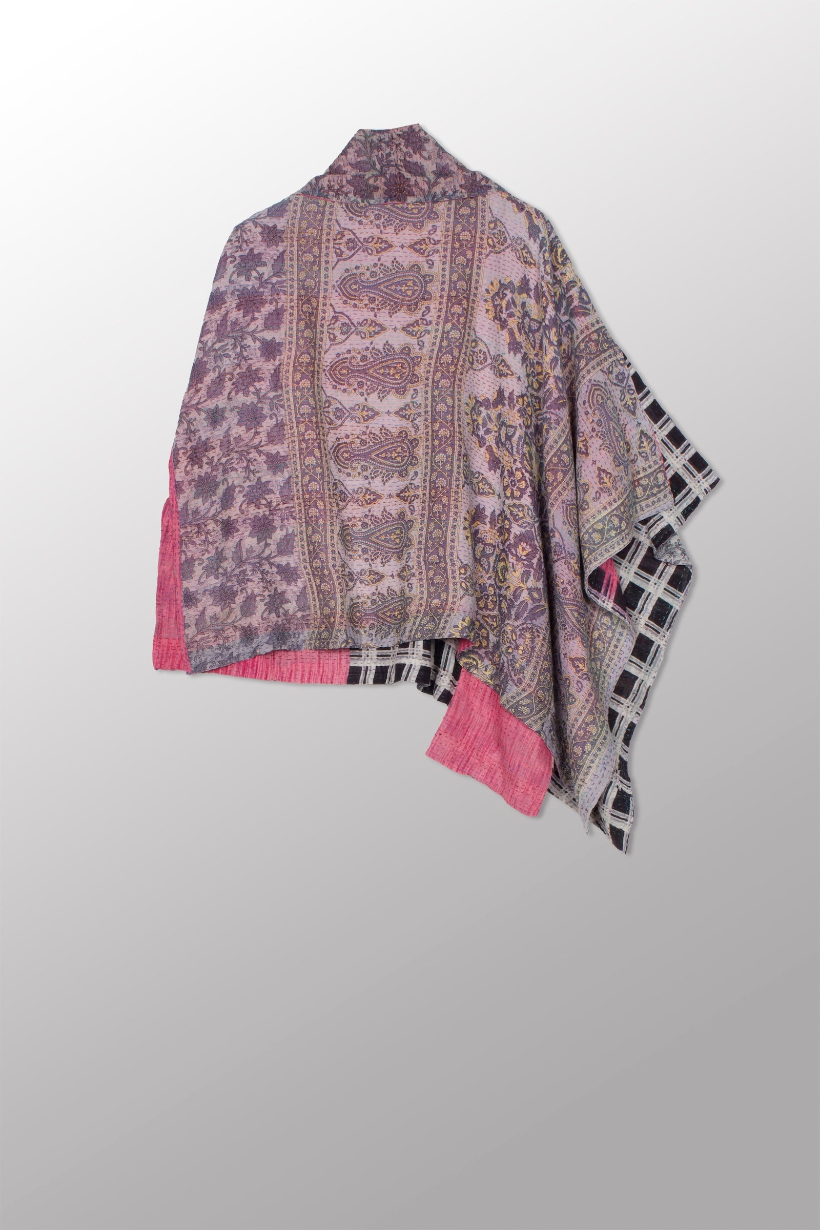 VINTAGE COTTON KANTHA COWL NECK LONG CAPE - cv2842-0001a -