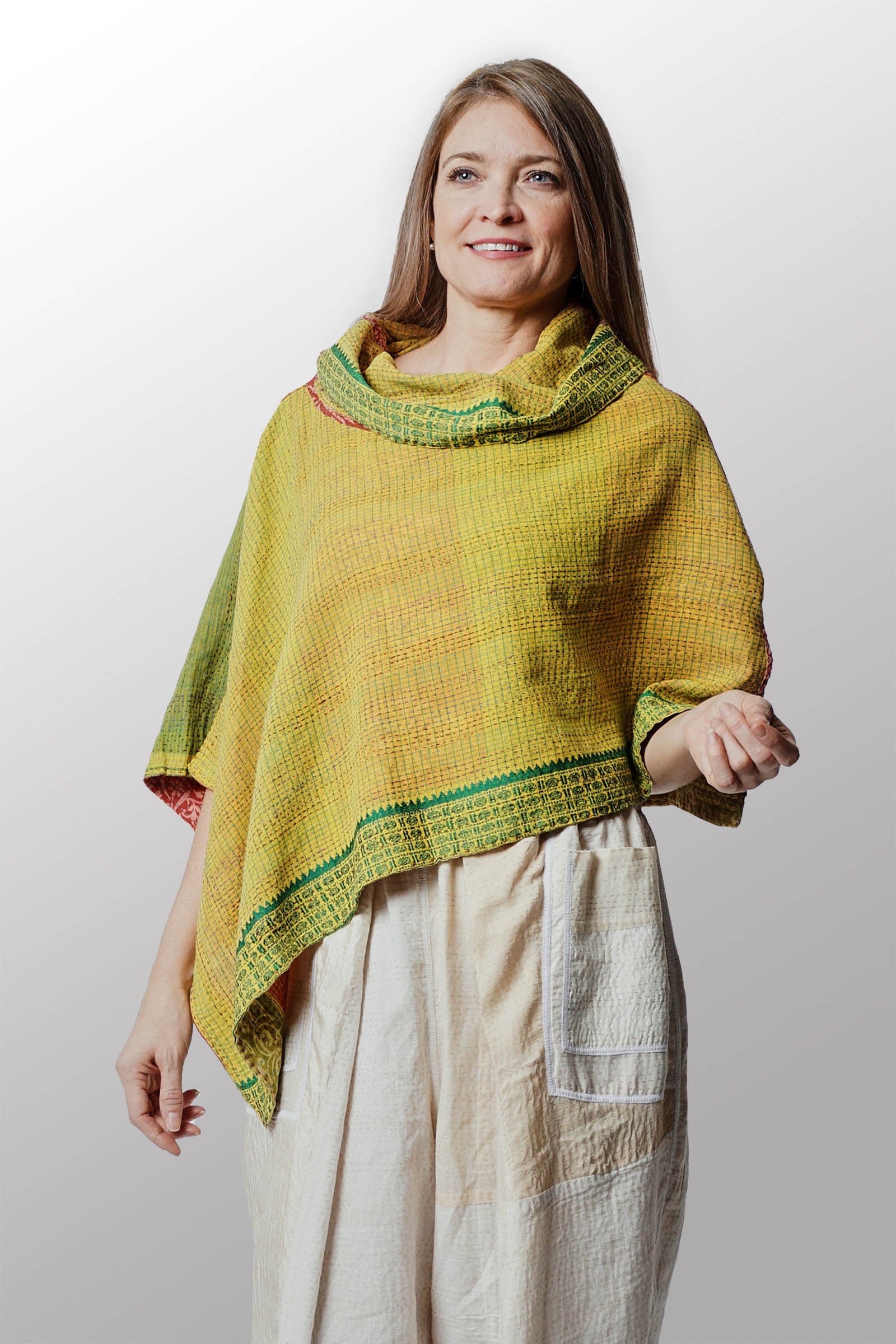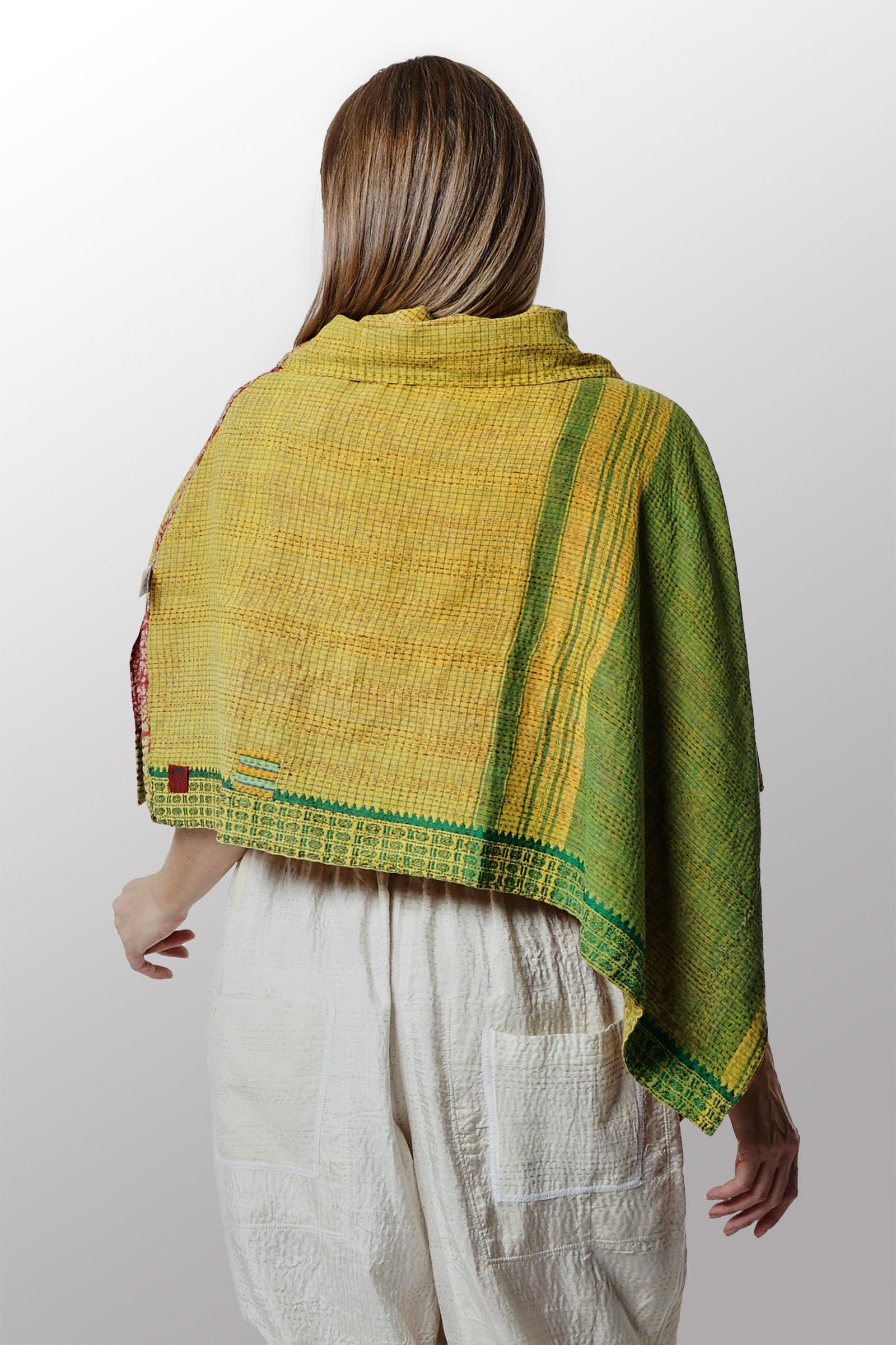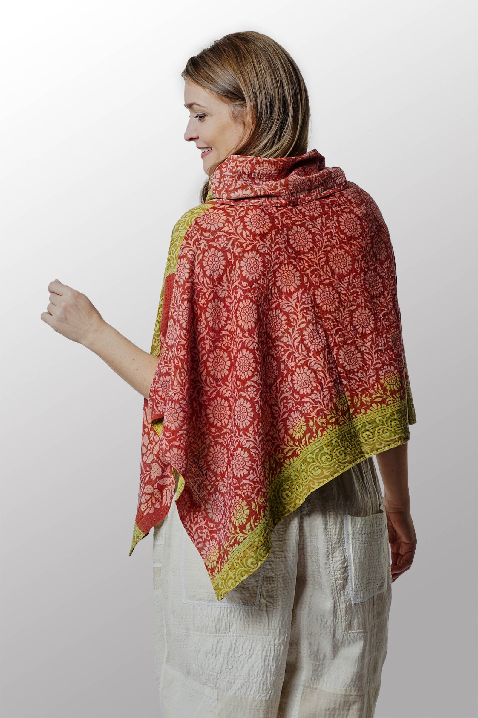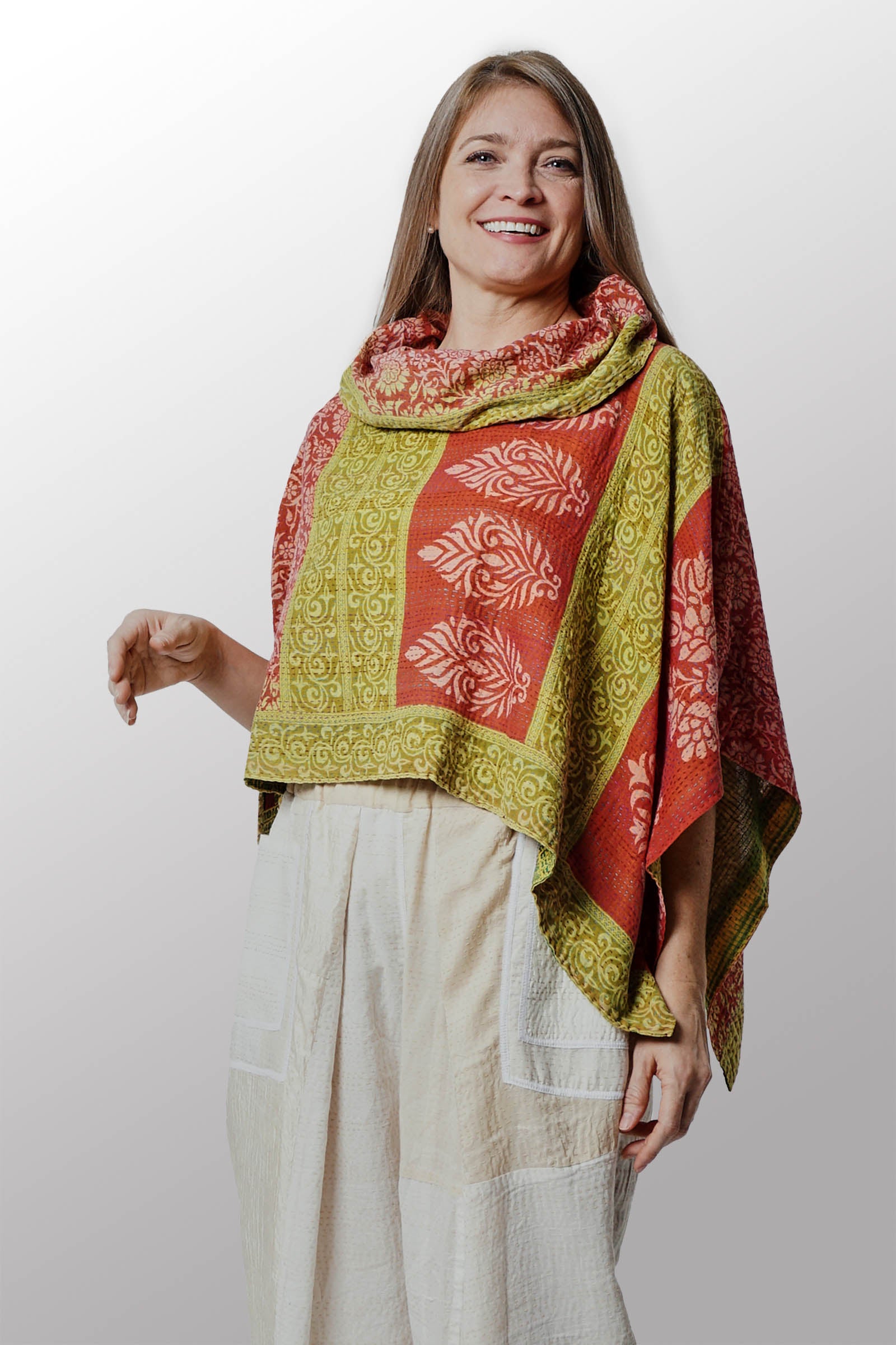 VINTAGE COTTON KANTHA COWL NECK WIDE CAPE - cv2843-brn -