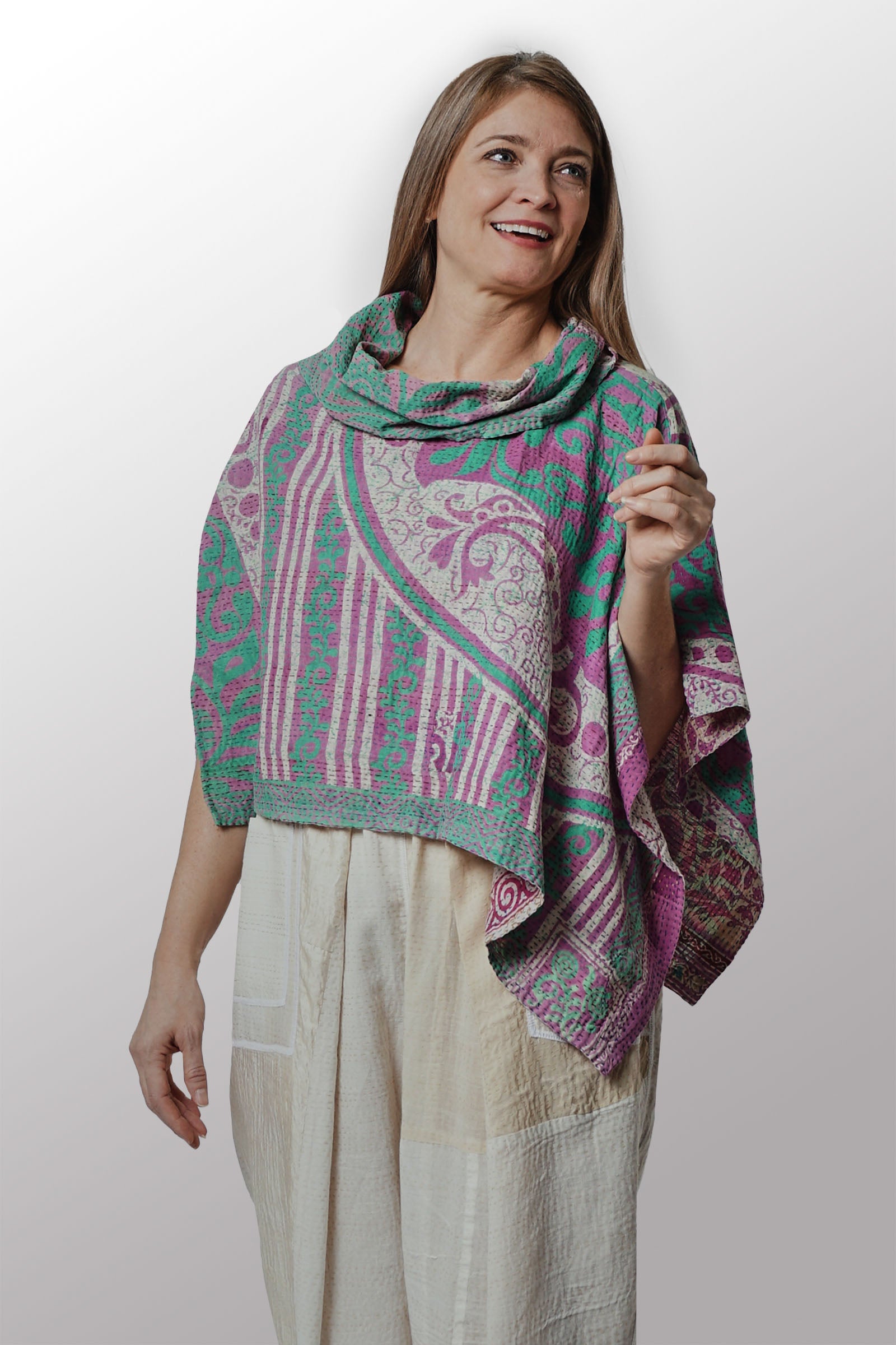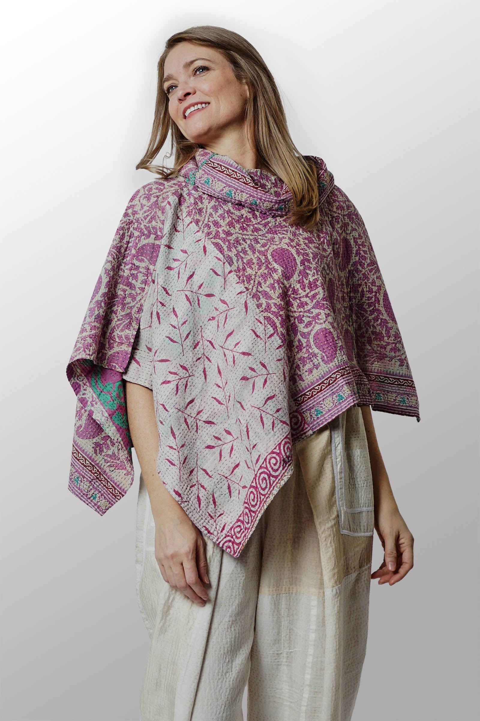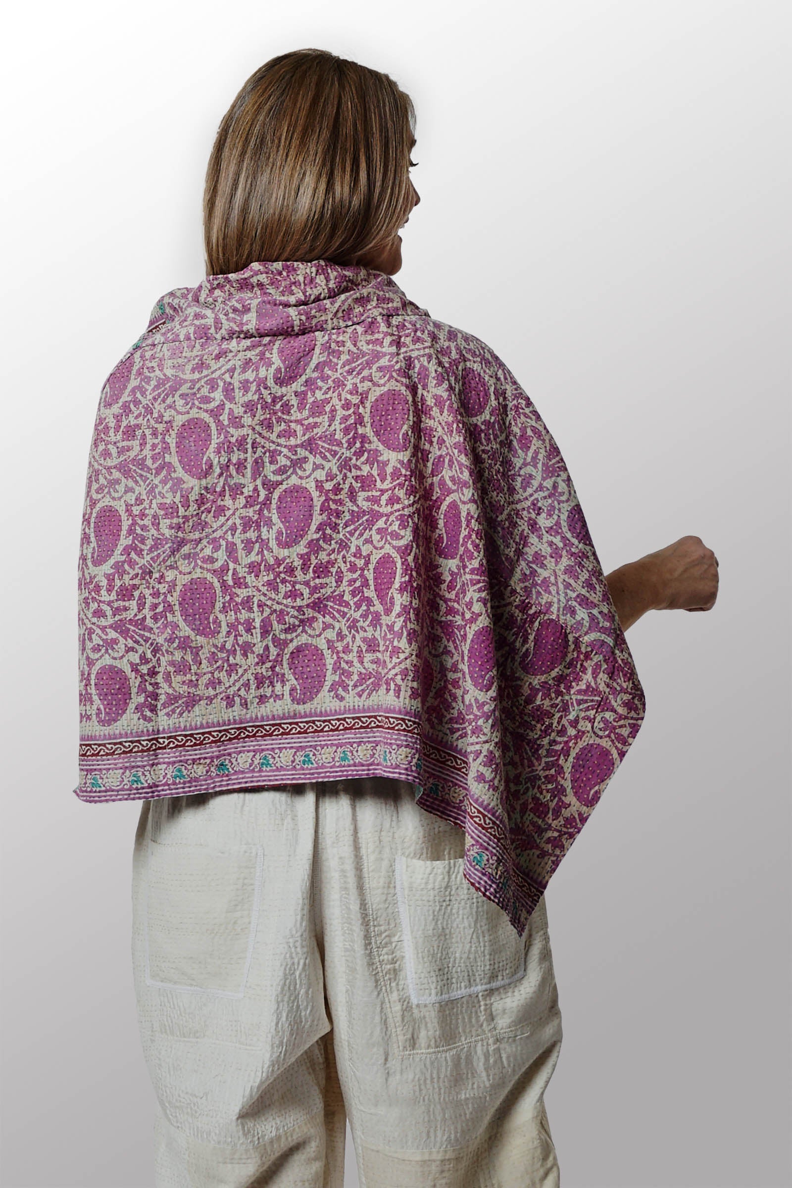 VINTAGE COTTON KANTHA COWL NECK WIDE CAPE - cv2843-pik -