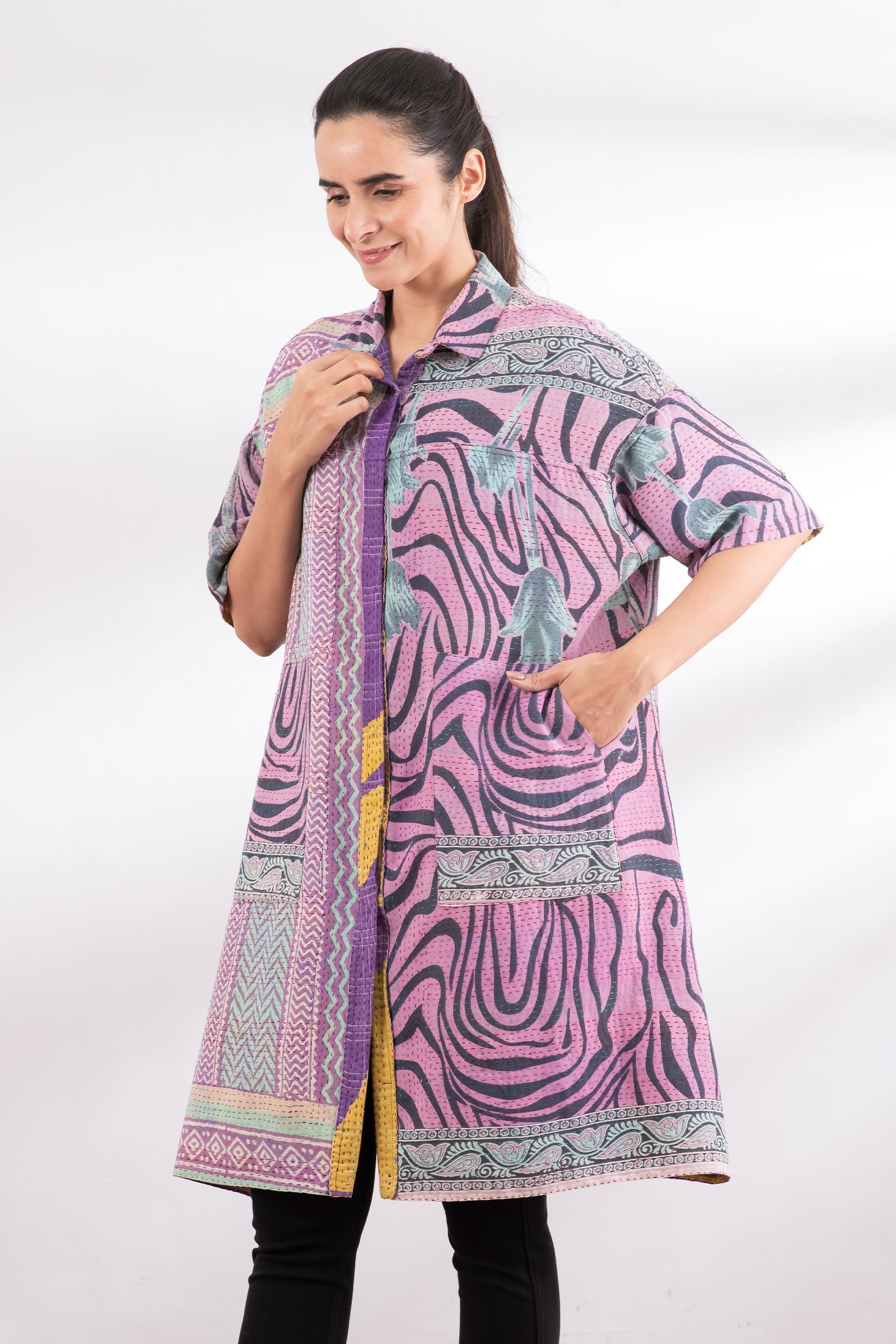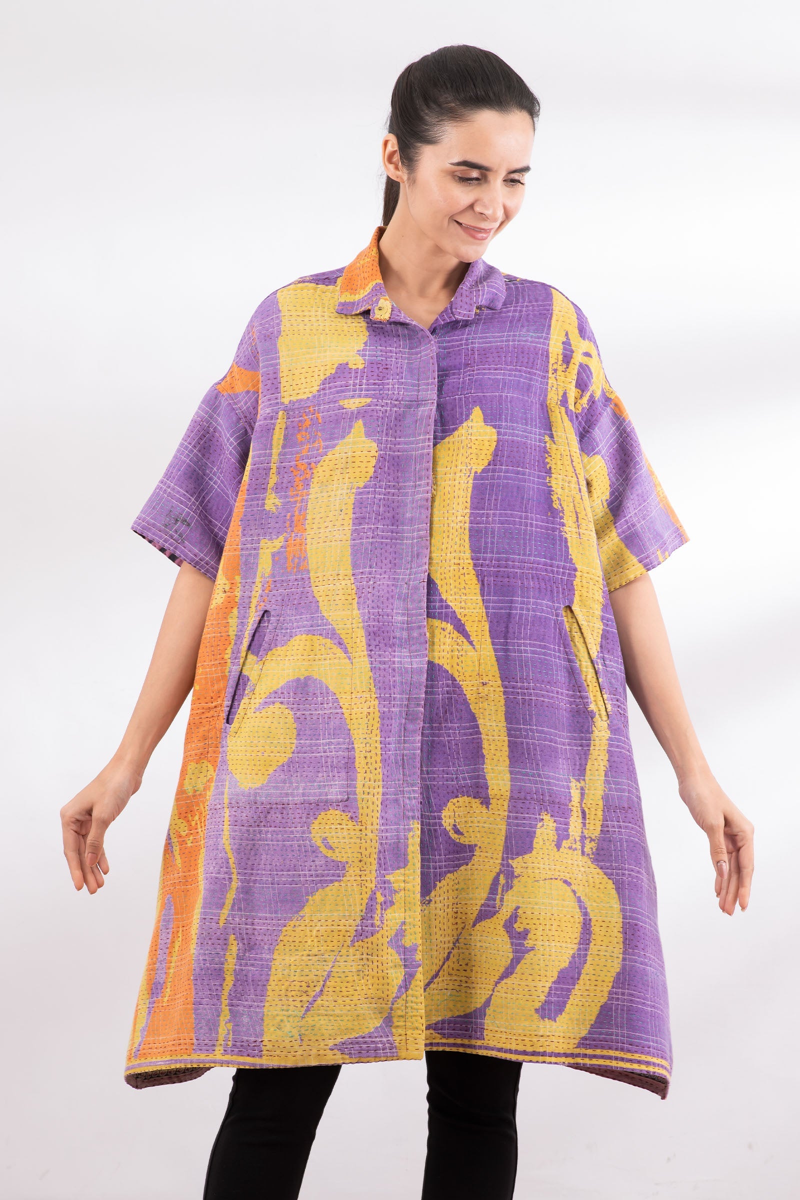 VINTAGE COTTON KANTHA HALF SLV. SHIRT DRESS - cv2429-0004a -