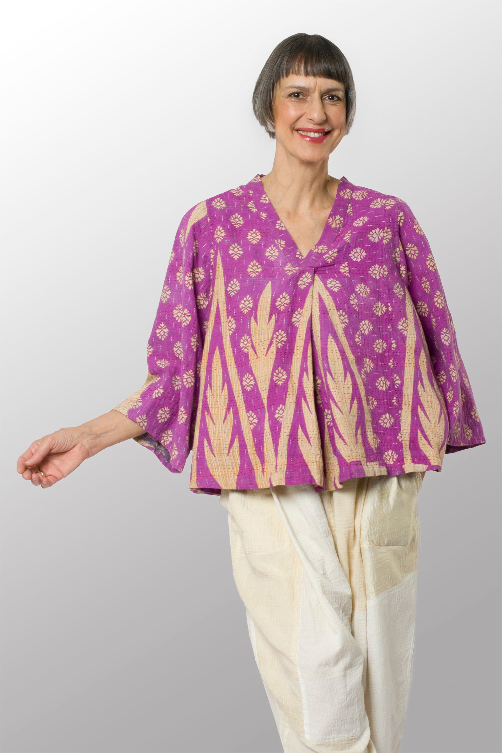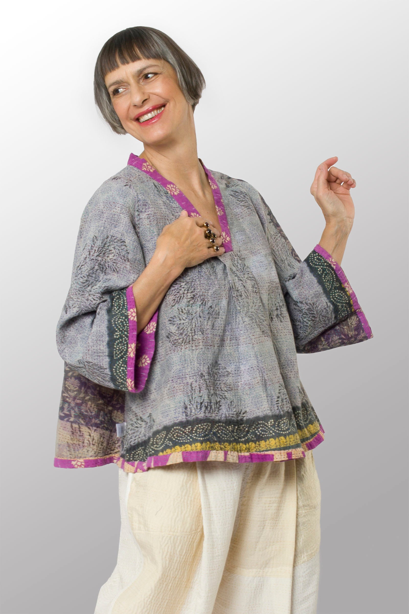 VINTAGE COTTON KANTHA V-NECK FLARE TOP - cv2567-0001m -