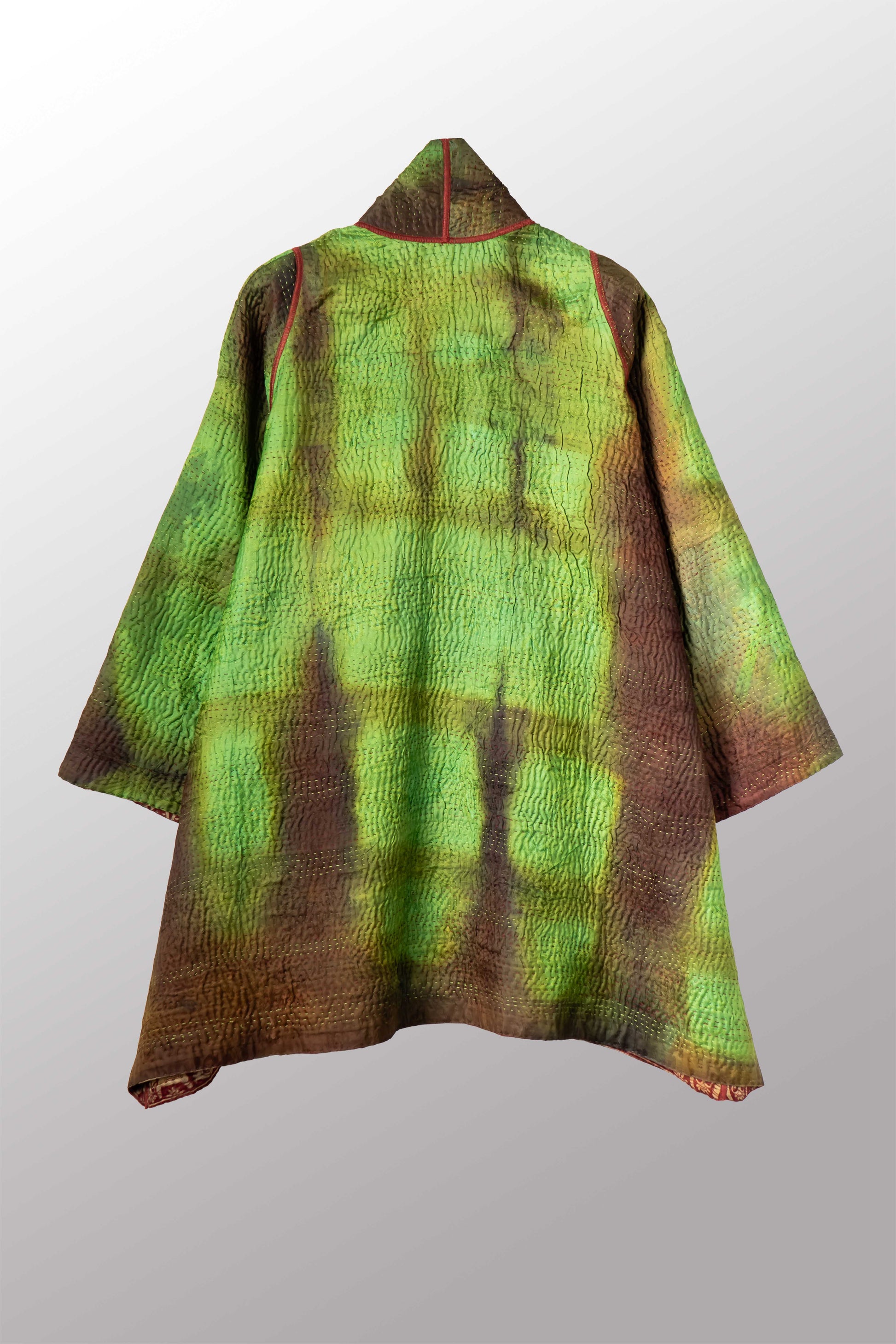 VINTAGE JACQUARD CLAMP DYE WITH PRINTED SILK KANTHA A-LINE JACKET - jk4003-0002a -