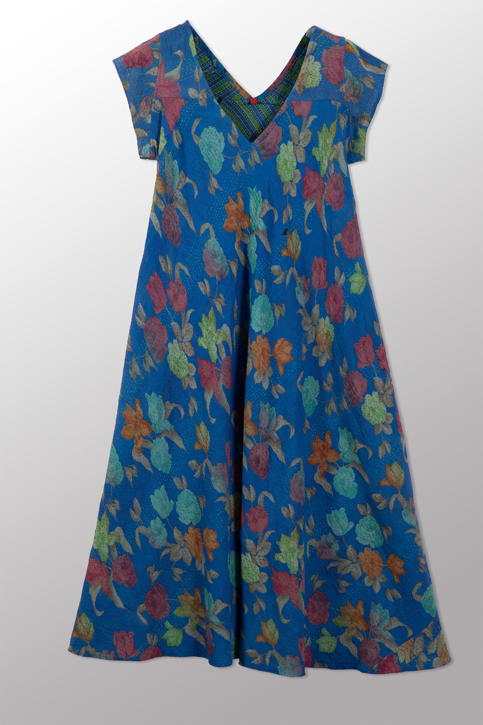 VINTAGE SILK GEORGETTE COTTON KANTHA CAP SLV. FLARE DRESS - gc2425-0002s -