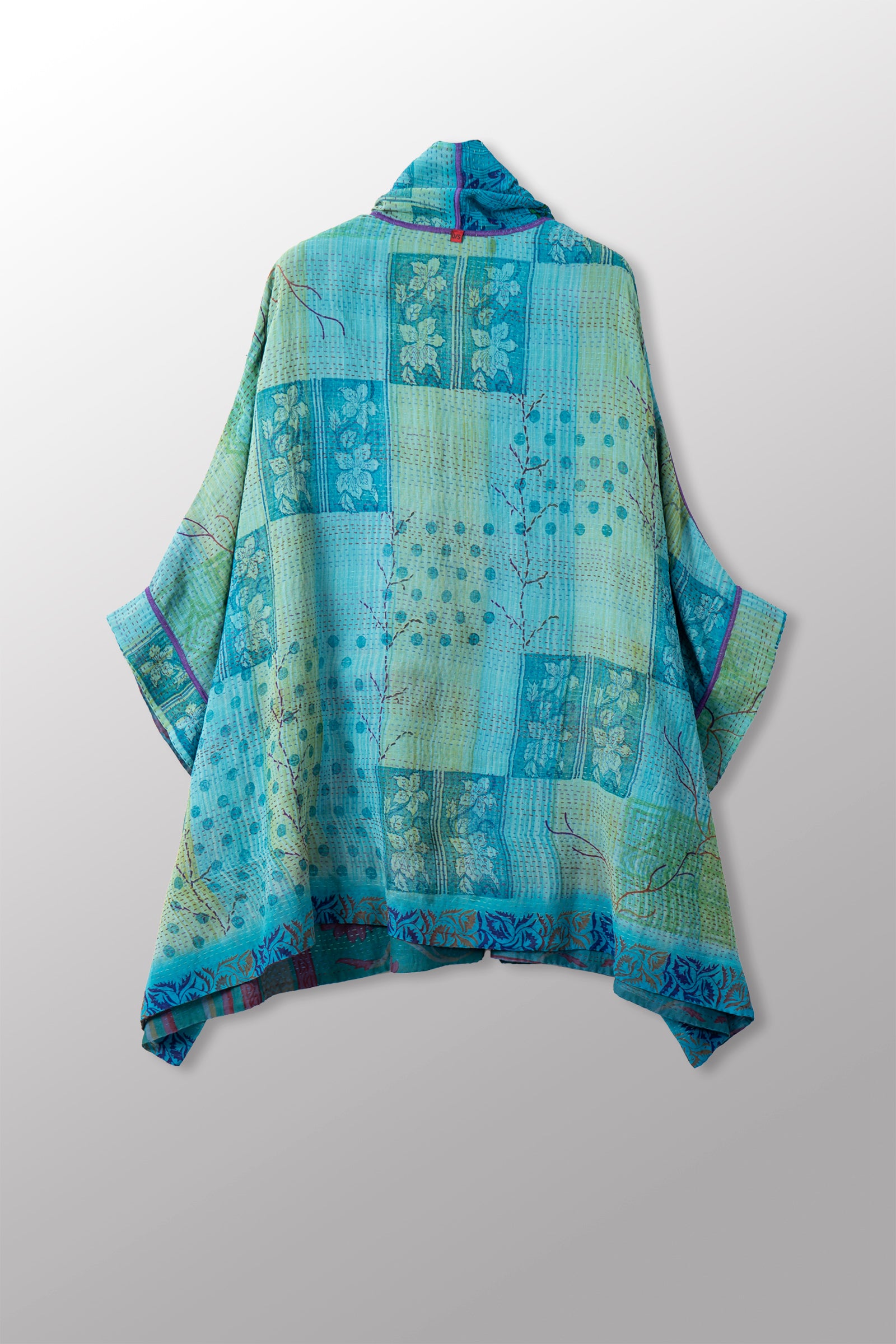 VINTAGE SILK GEORGETTE COTTON KANTHA DOUBLE COLLAR PONCHO - gc2323-0002a -