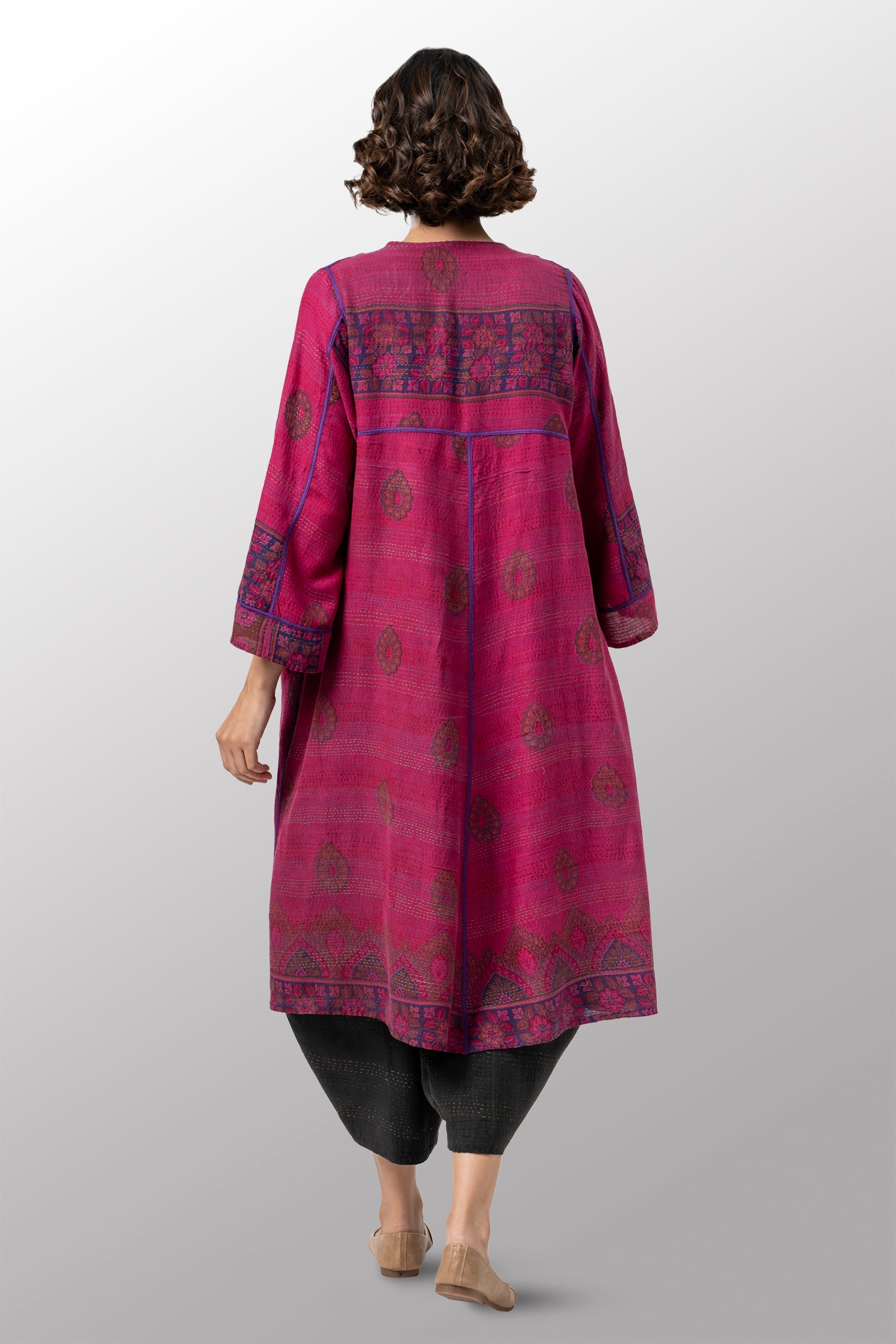 VINTAGE SILK GEORGETTE COTTON KANTHA WRAP FLARE COAT - gc2330-0002a -