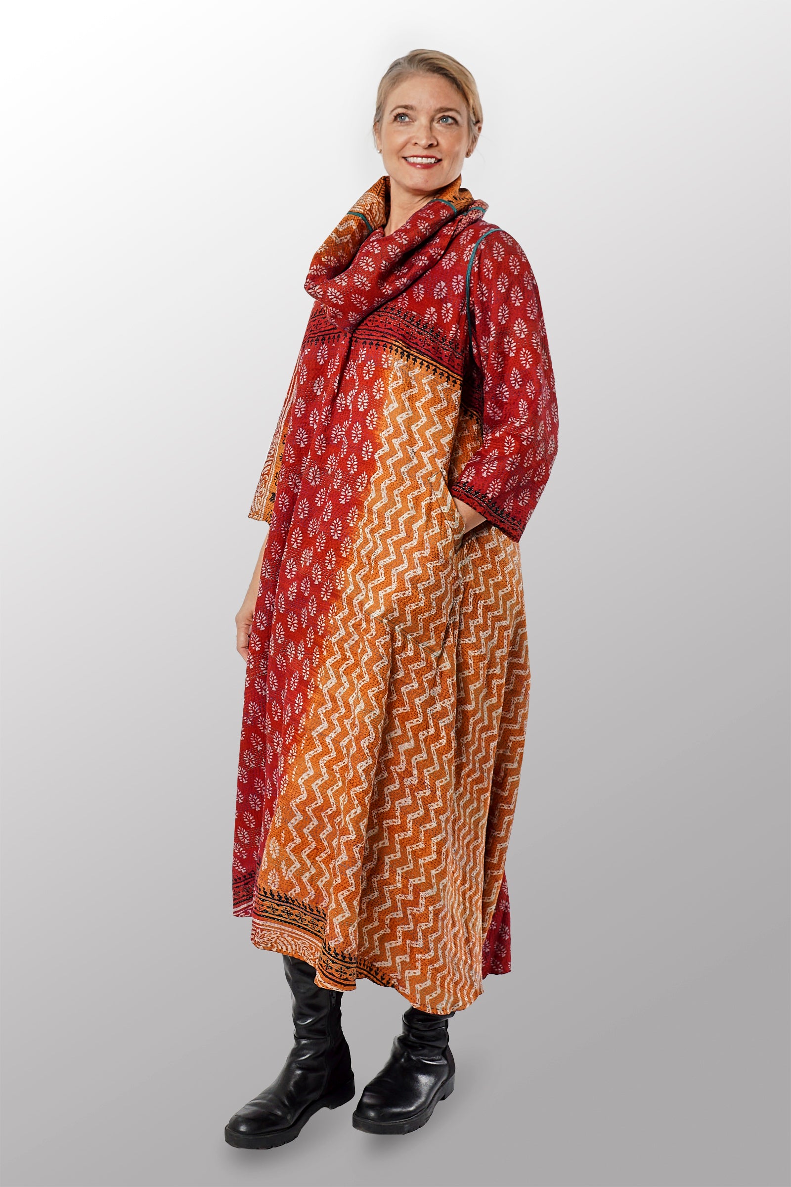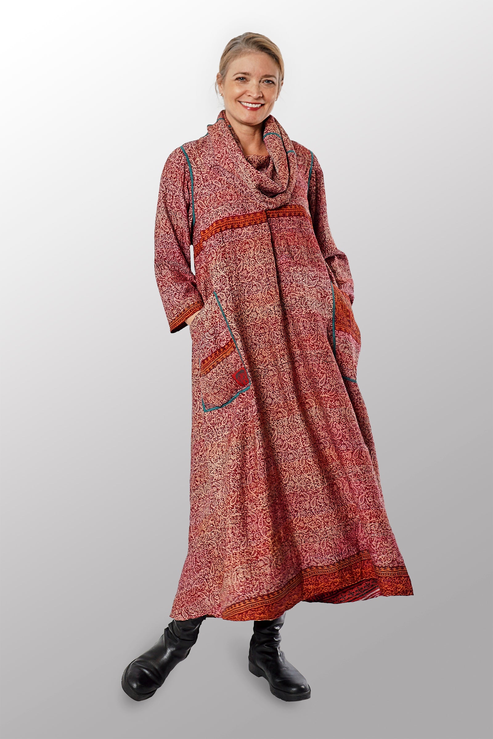 VINTAGE SILK GEORGETTE KANTHA COWL NECK LONG SLEEVE DRESS - sg2450-0004s -