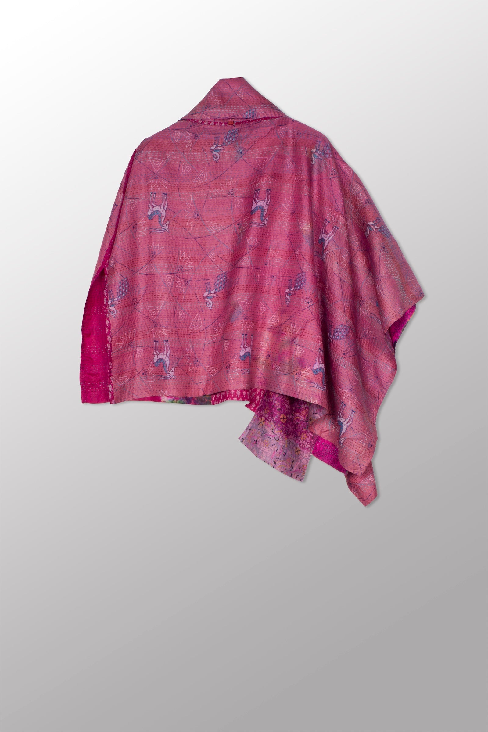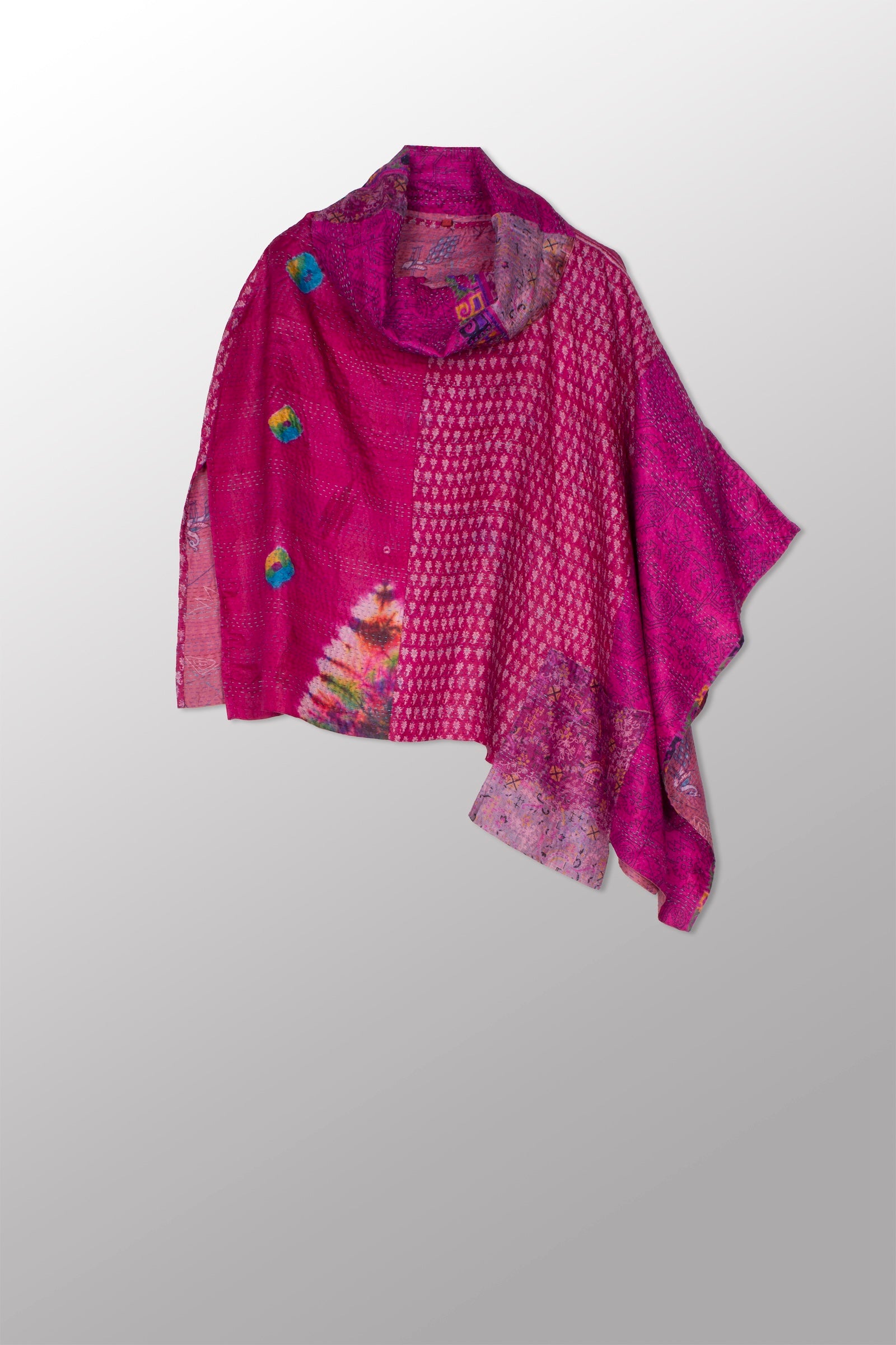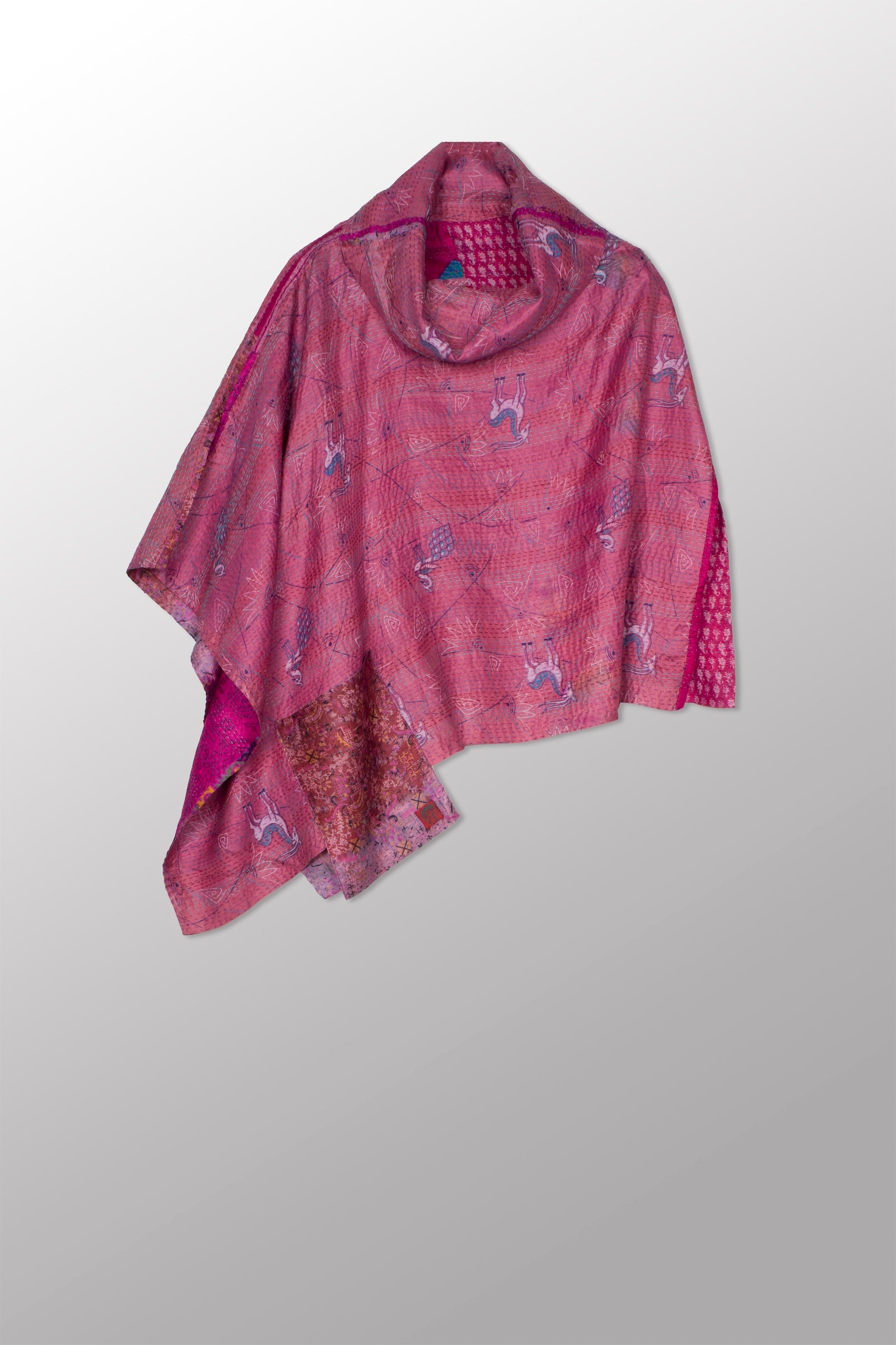 VINTAGE SILK KANTHA COWL NECK LONG CAPE - sv2842-mlt -