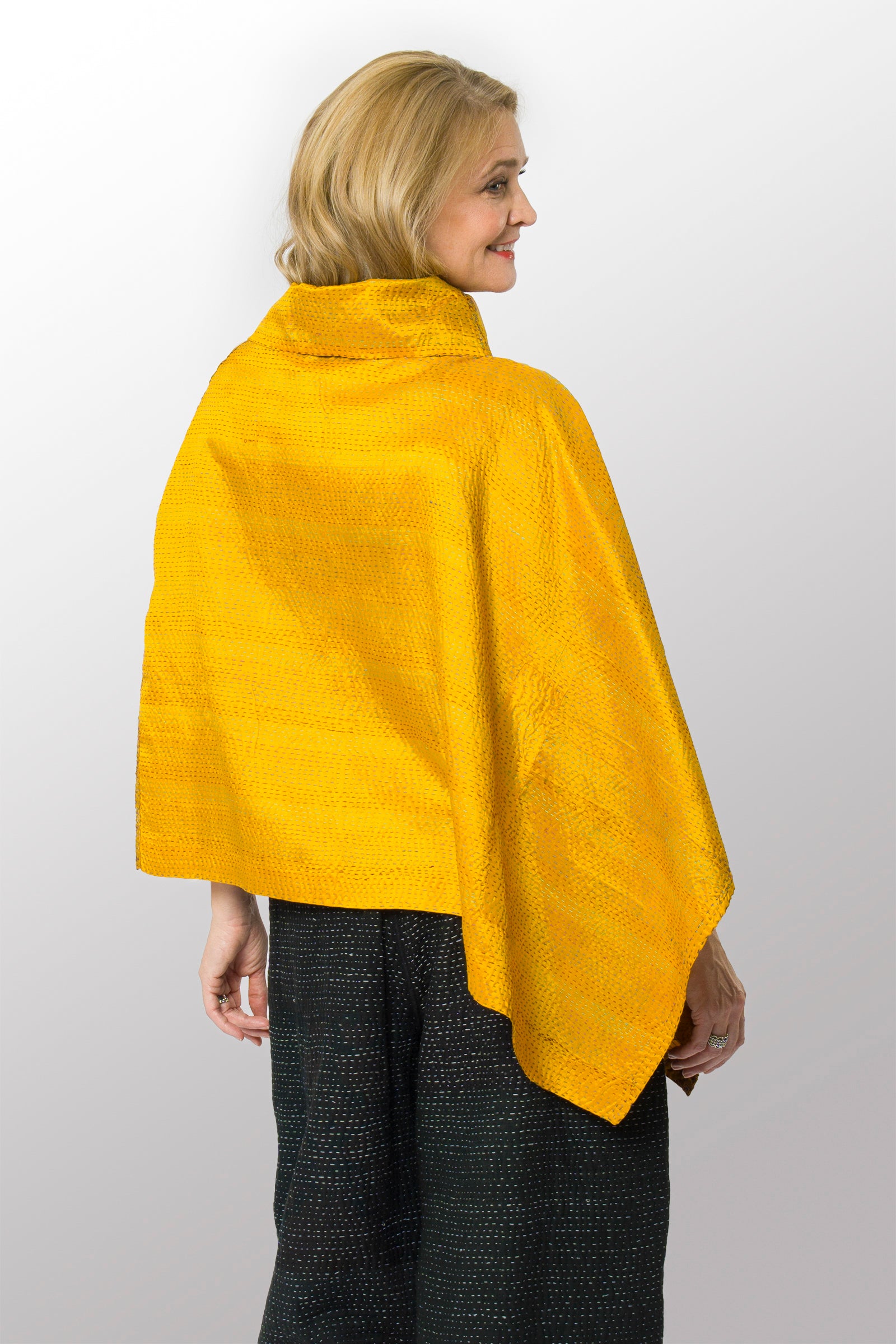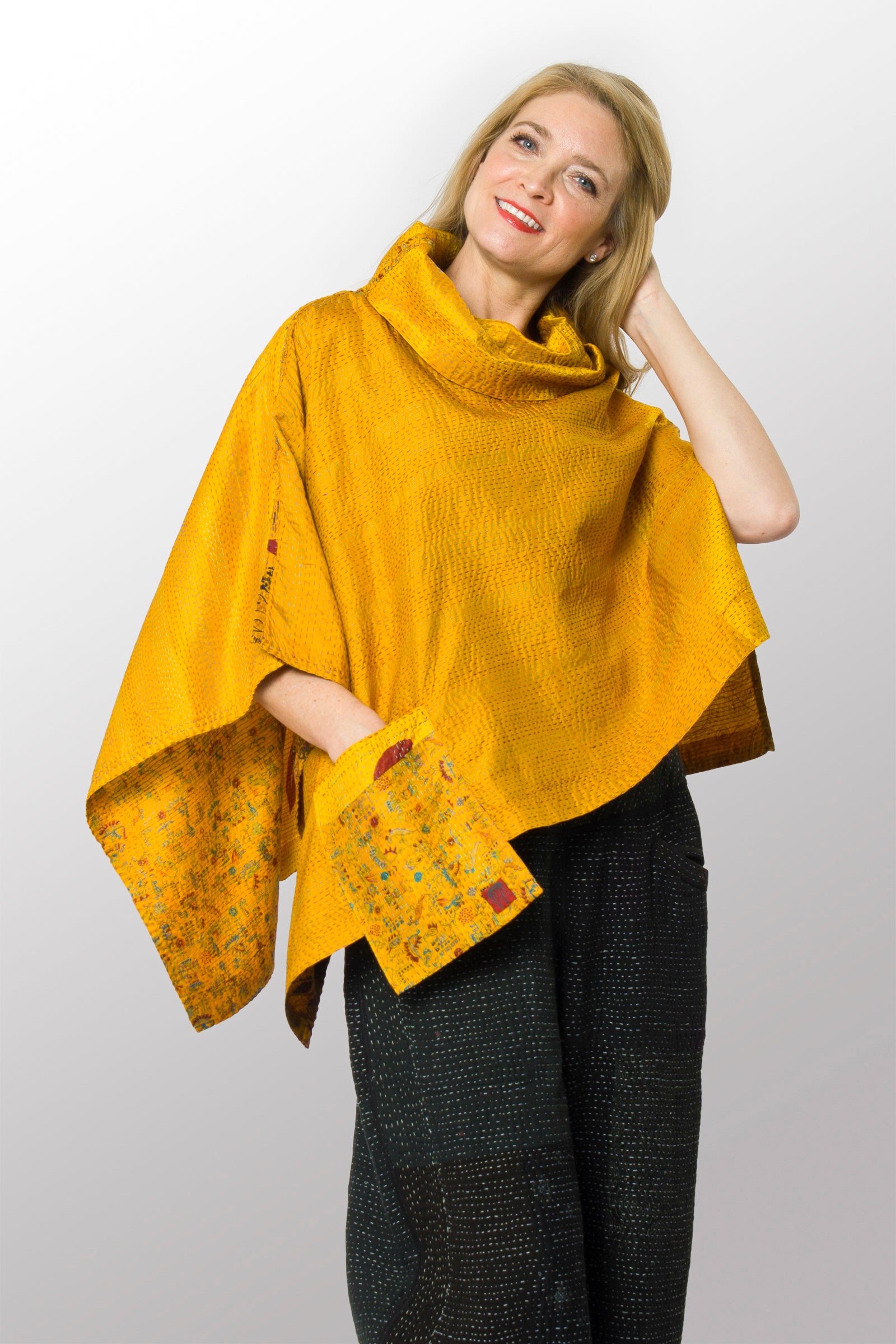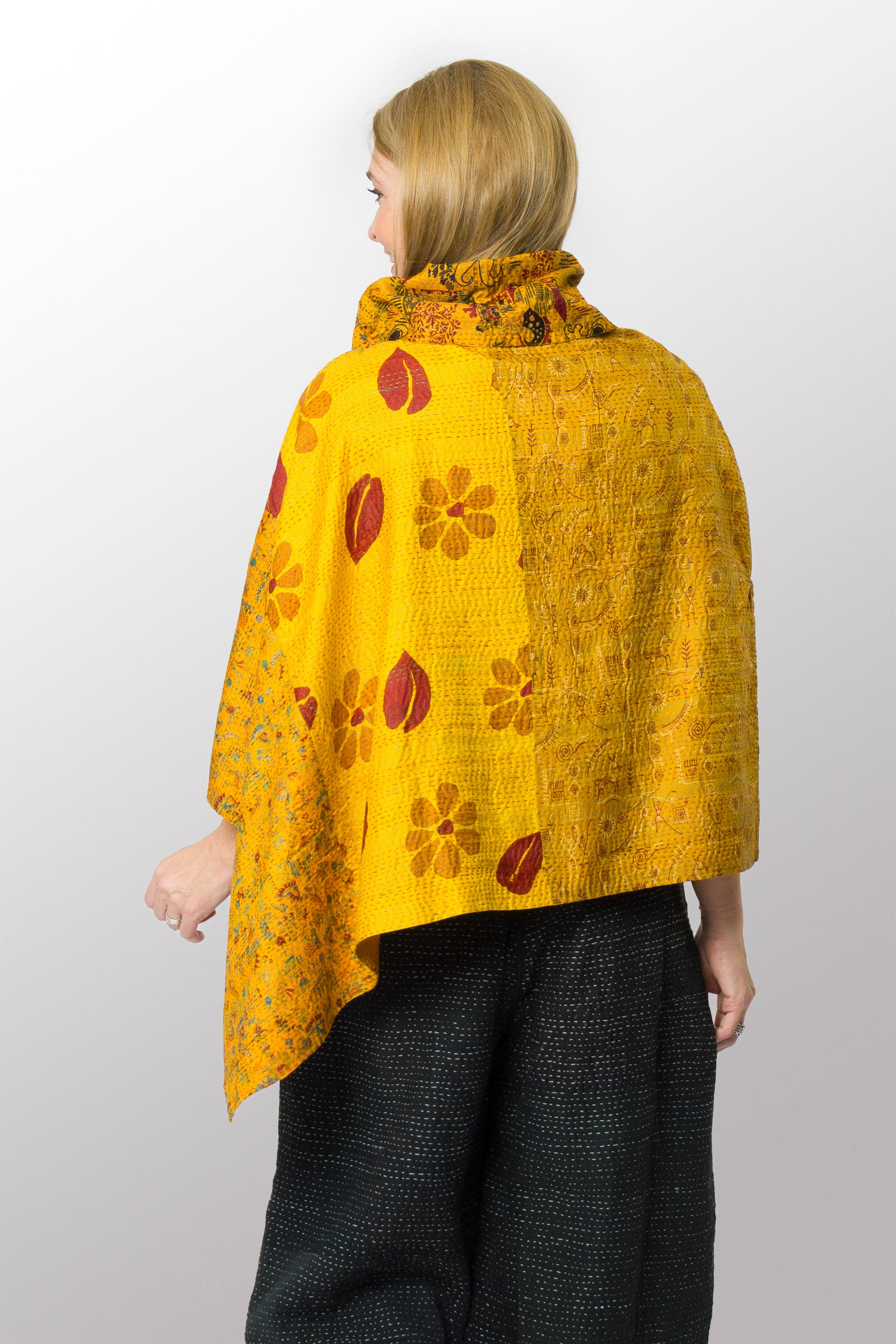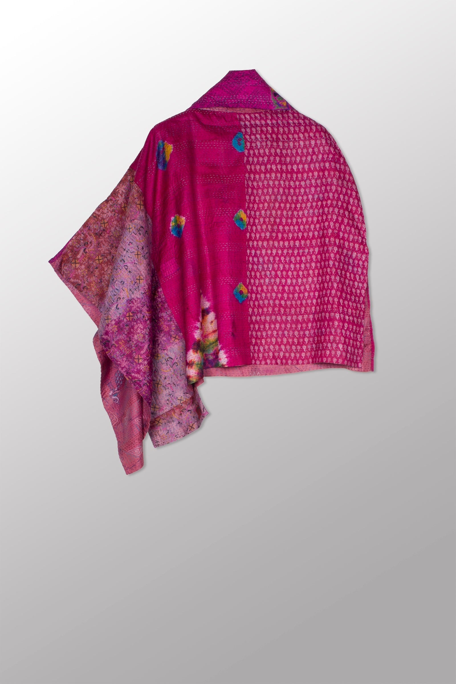 VINTAGE SILK KANTHA COWL NECK LONG CAPE - sv2842-mlt -