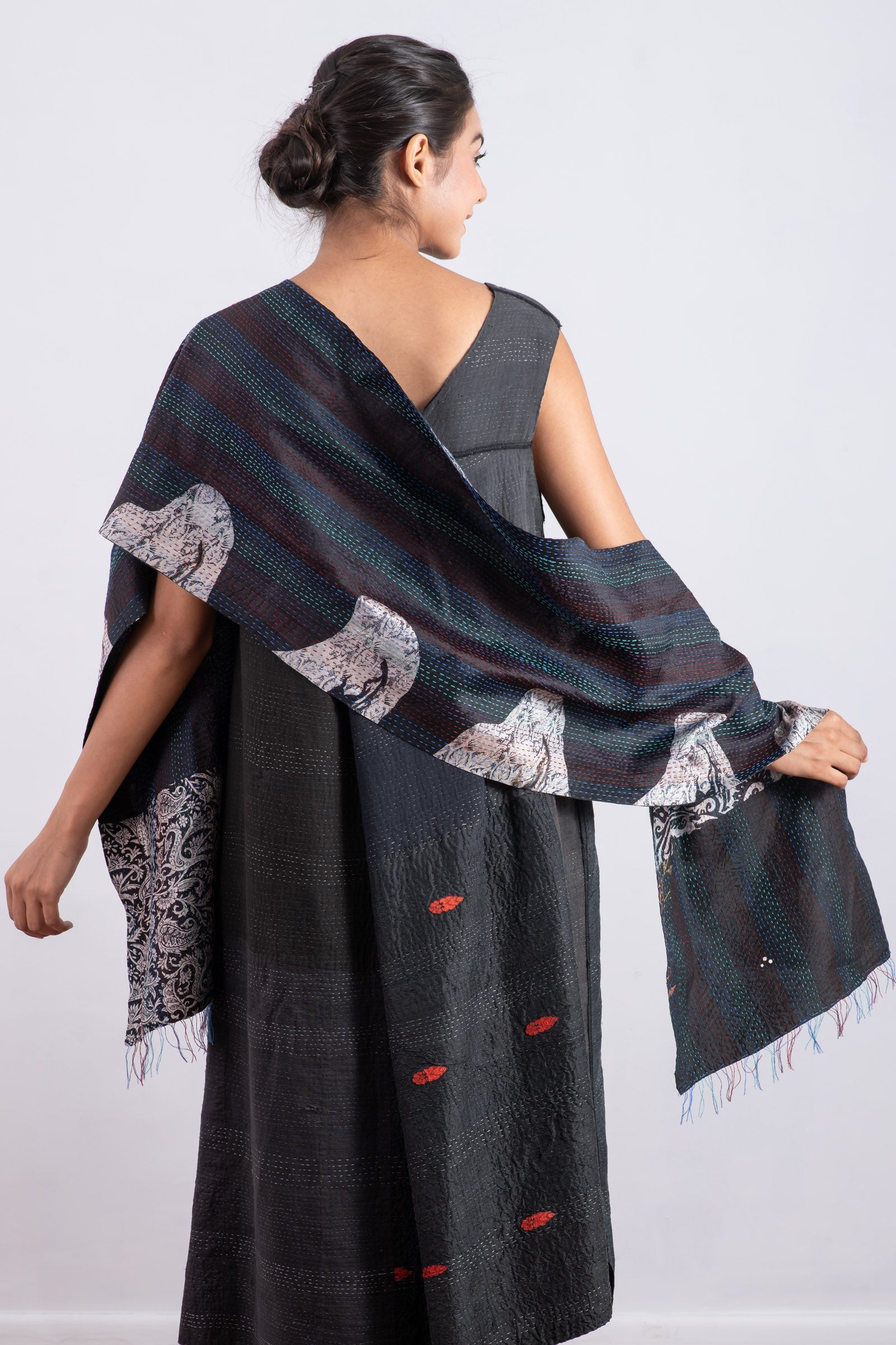 VINTAGE SILK KANTHA SCARF SMALL - sv2800-blk -
