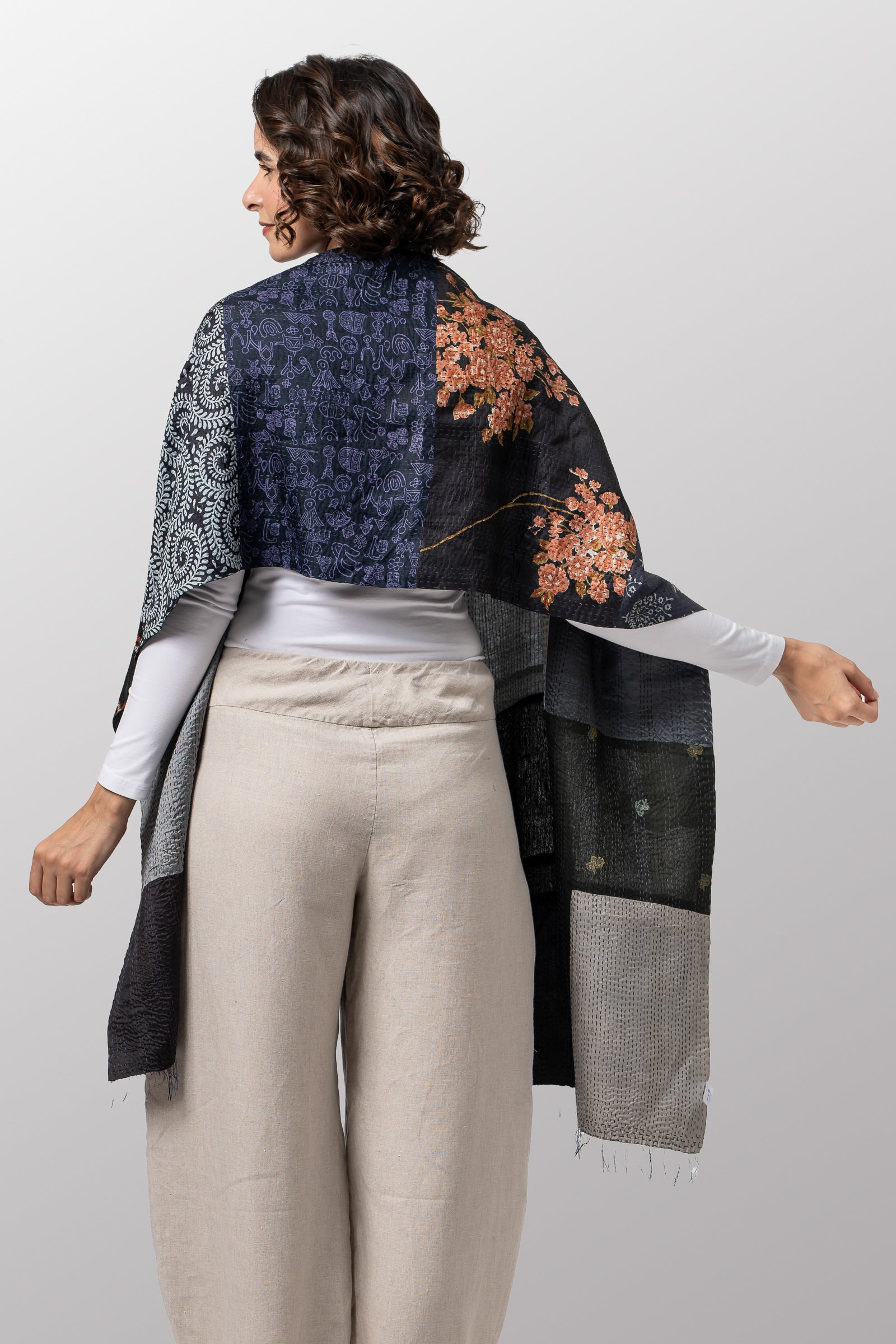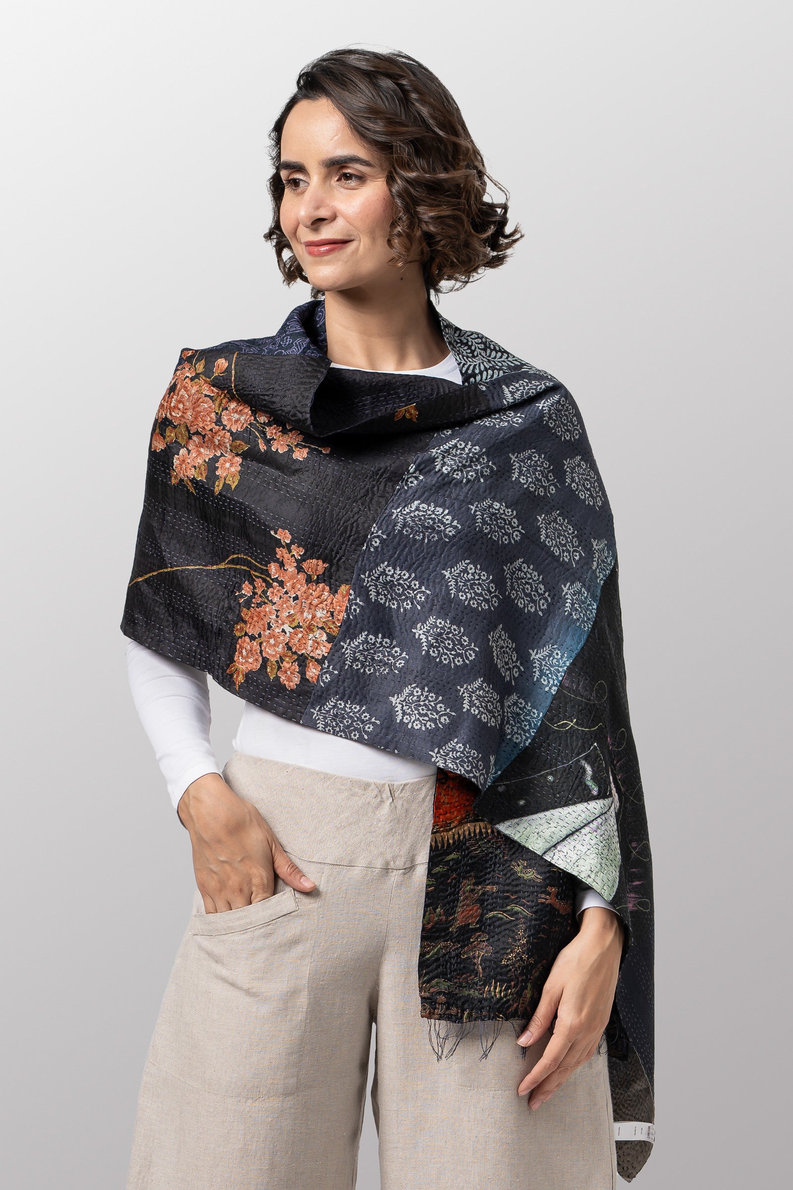 VINTAGE SILK PATCH KANTHA SCARF STANDARD - vp2801-blk -